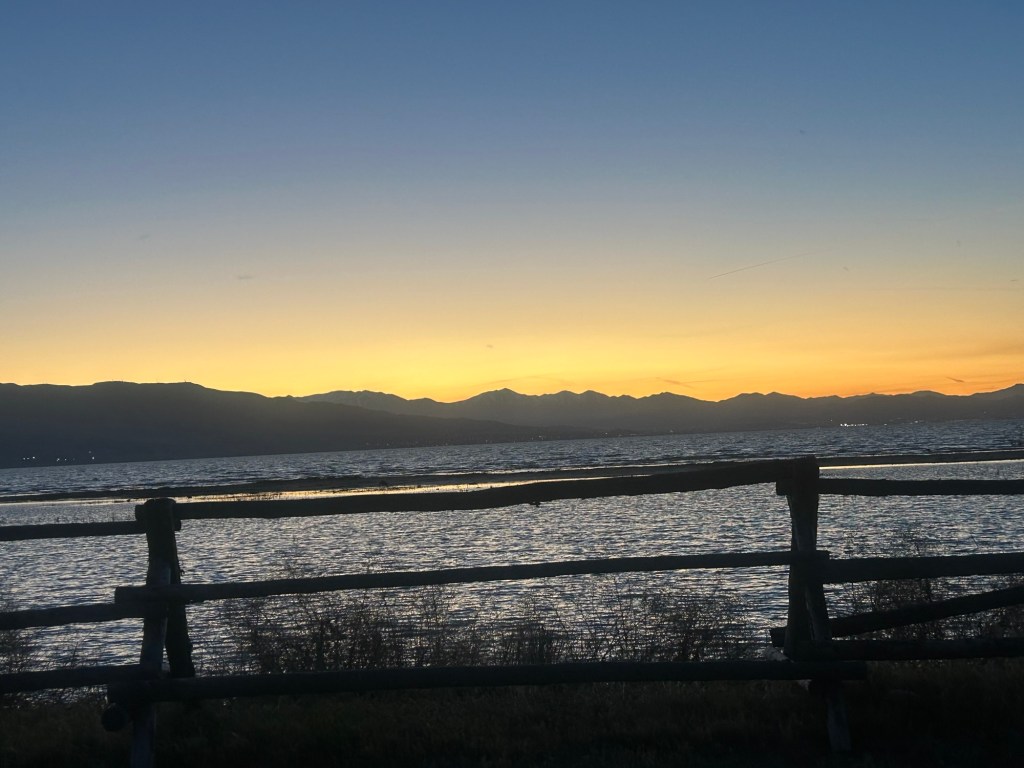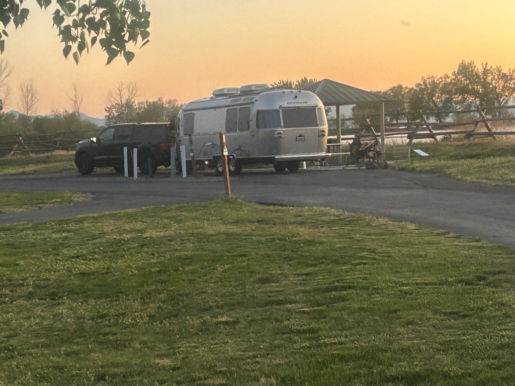 The day started full of ambition, with visions of a long but smooth drive from beautiful Utah Lake State Park to Laramie, Wyoming. We’d hitched the trailer last night, ready for an early start, which we got. Peter was up before dawn, doing the final preparations to leave and I followed suit. Just as the sun was rising we were off and decided to go to the public sewer spot before leaving just to have a clean start after the showers and dishes we’d done over the past two days, confident in our newly repaired system (at great expense, but I’ll leave that for another day).