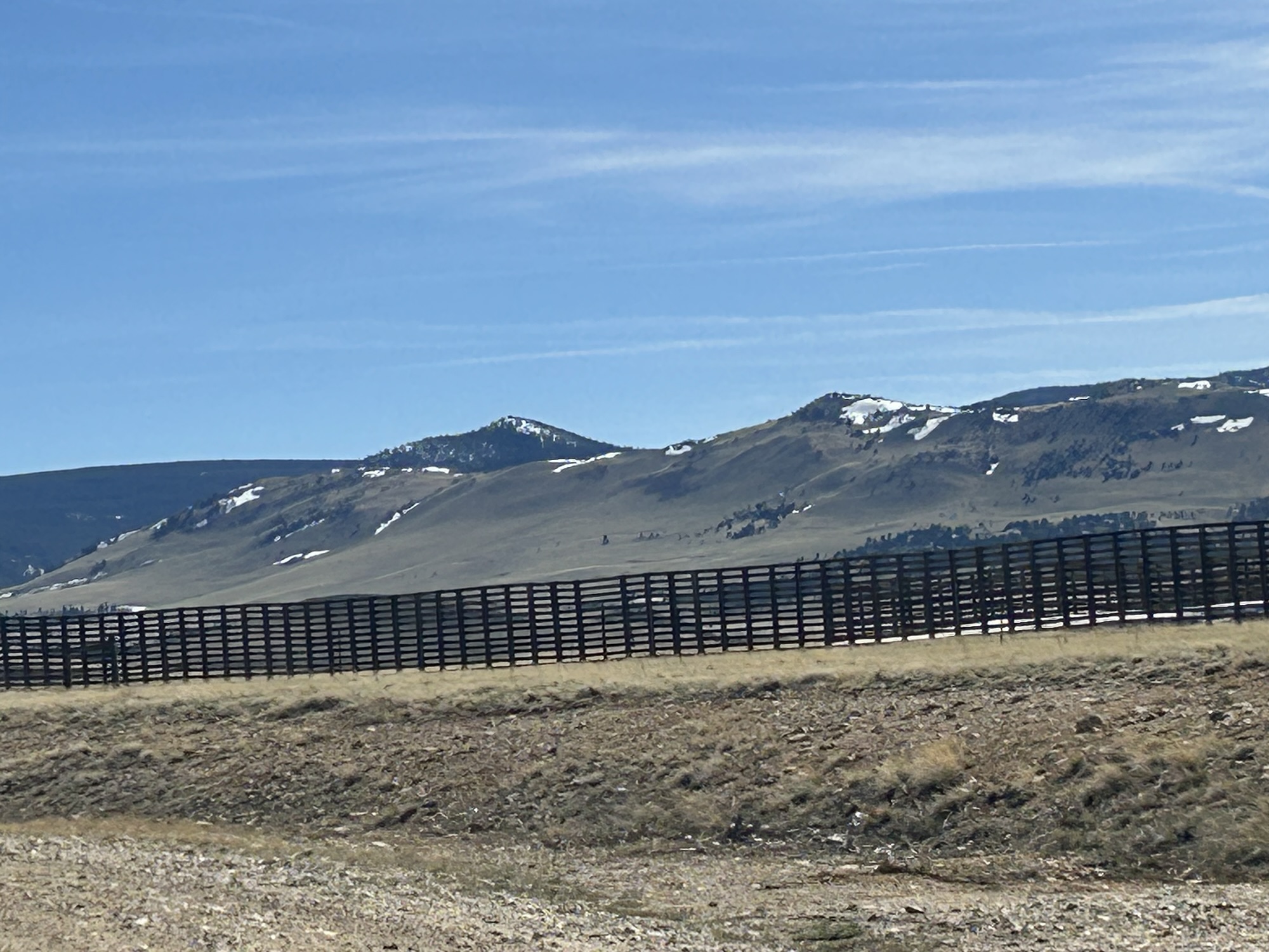 We didn’t get caught and went on our way, past high country brown fields still dotted with snow, diamond sparkling snowy mountain ranges in the far distance and generally a lot of nothing. There were some unusual striated exposed rocky hillsides of shades of grey and some pink. Towns dotted the countryside every 200 miles or so. It’s a pretty desolate place and you get the feeling that a gold rush of oil or natural gas has created these overnight company towns filled with young men making their fortunes or at least hoping to.