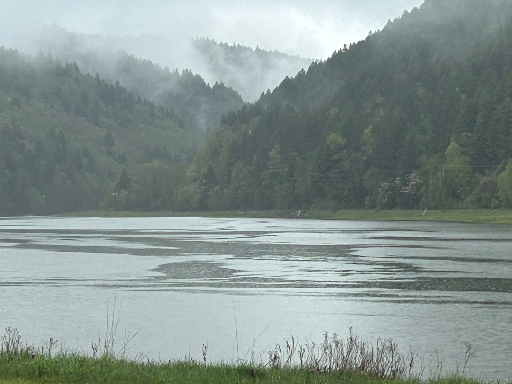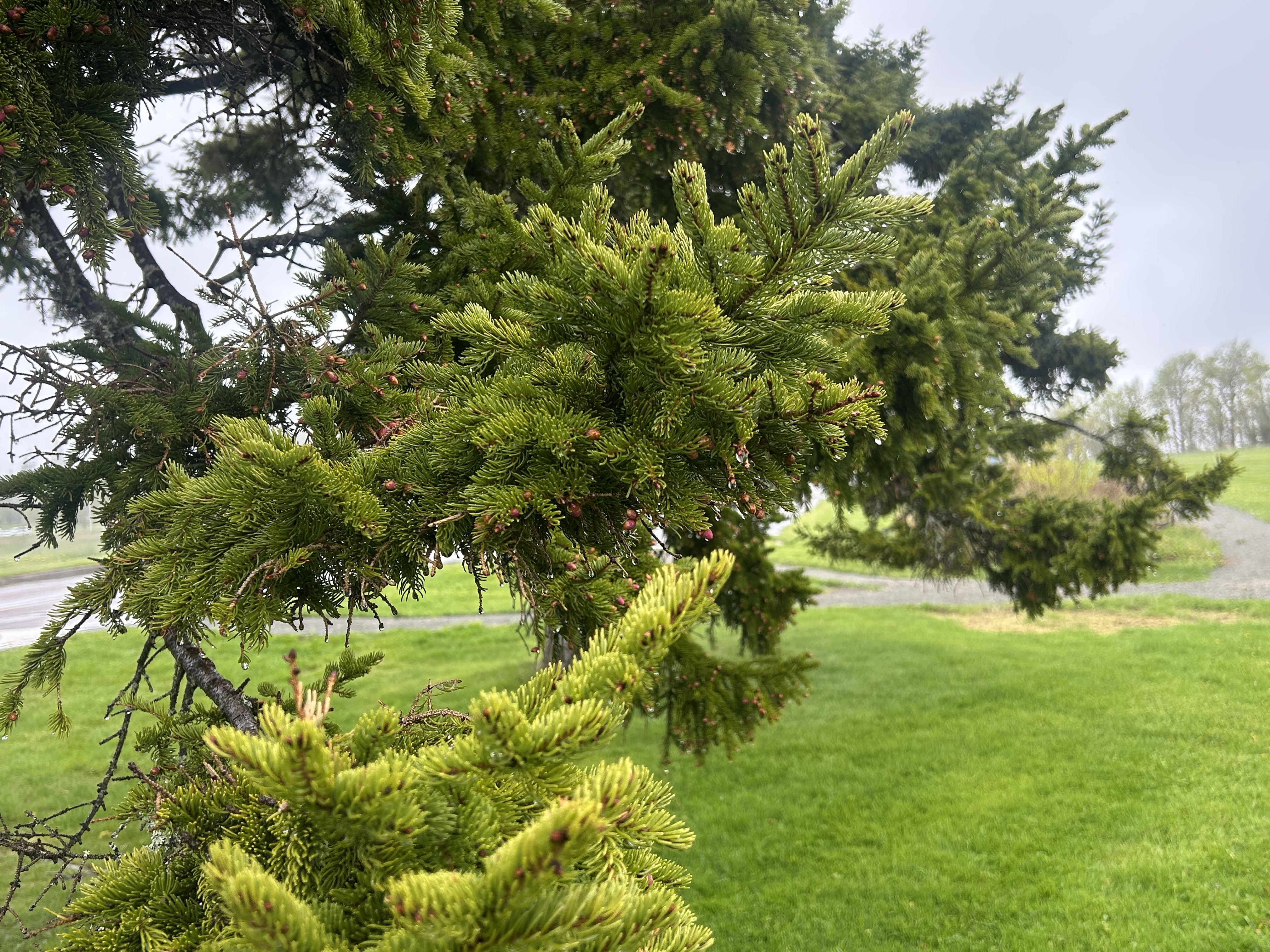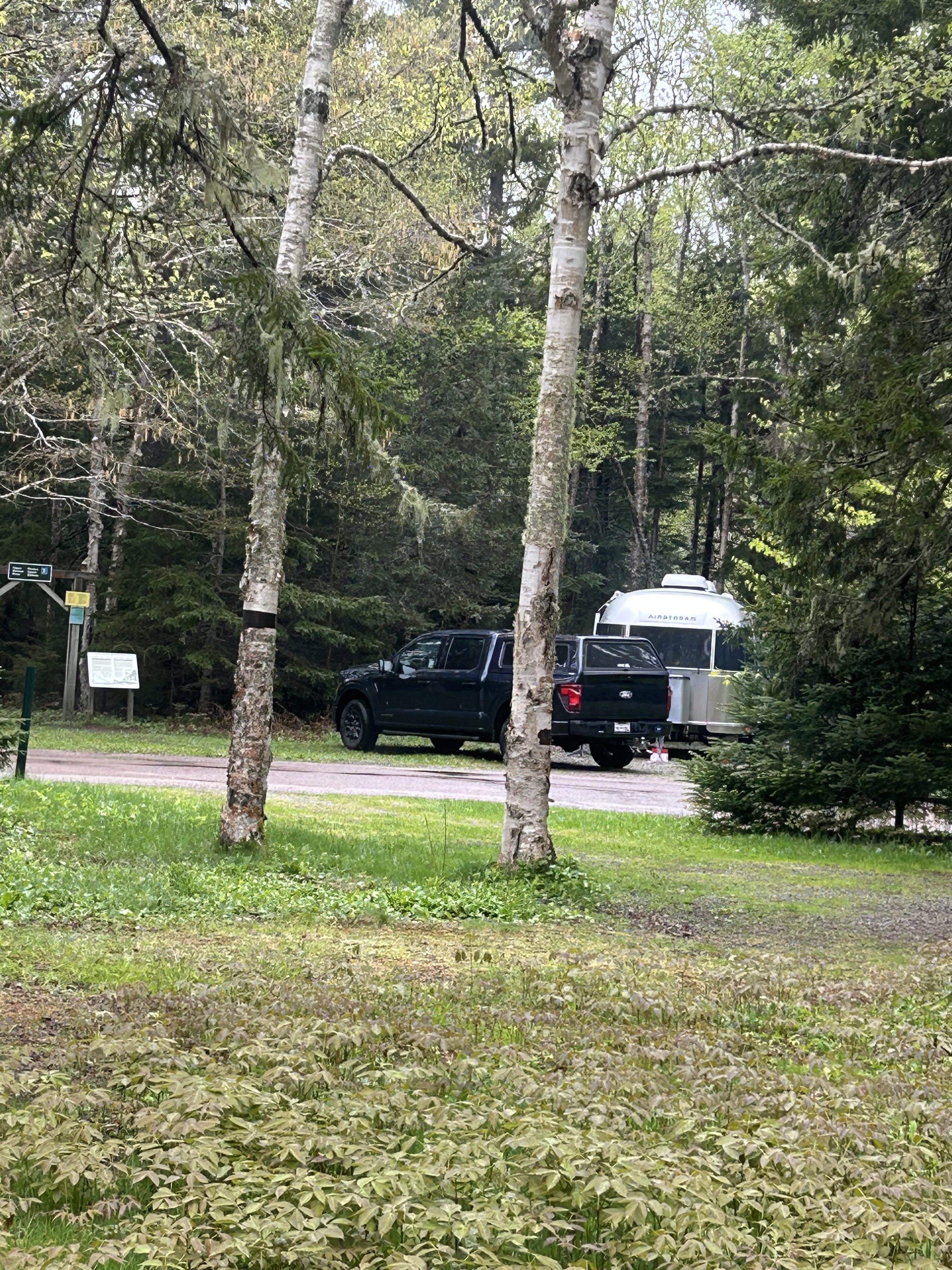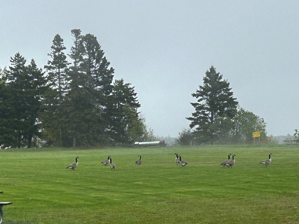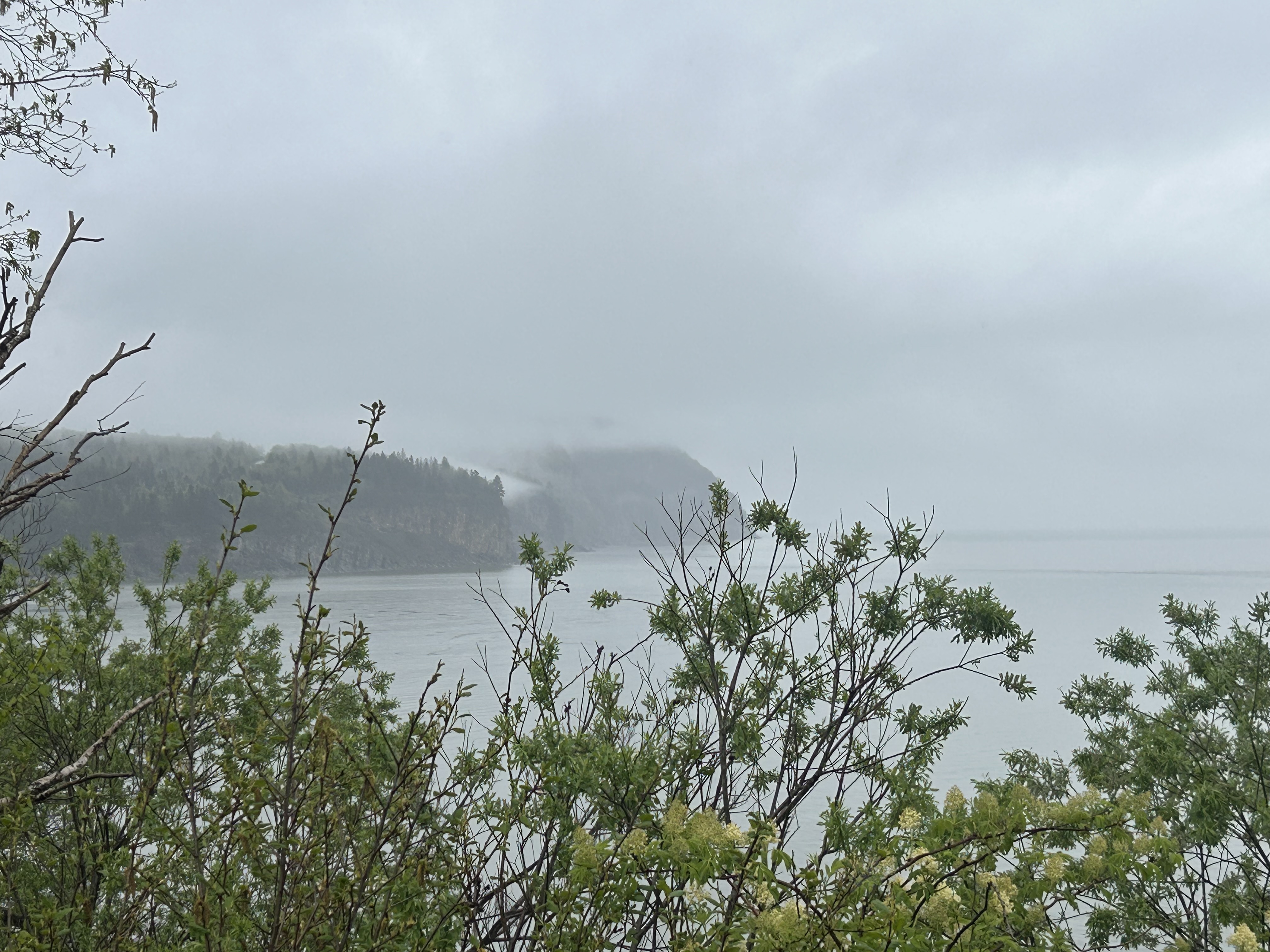 If you ever want to go to England in an RV, come to New Brunswick in late May! It continues to be cold (in the 40’s), foggy or cloudy and alternating between a steady light rain and drizzle. We decided to just dress right and get out in it, which we did today. The good news about being here before June is that no one else wants to camp in this weather (imagine that!), so our campground emptied out this morning and we are practically the only ones here. It’s about 5% occupied, if that. We have this whole “cul de sac” area to ourselves; no neighbors for several hundred yards on either side. Just trees, the salmon river and us.
