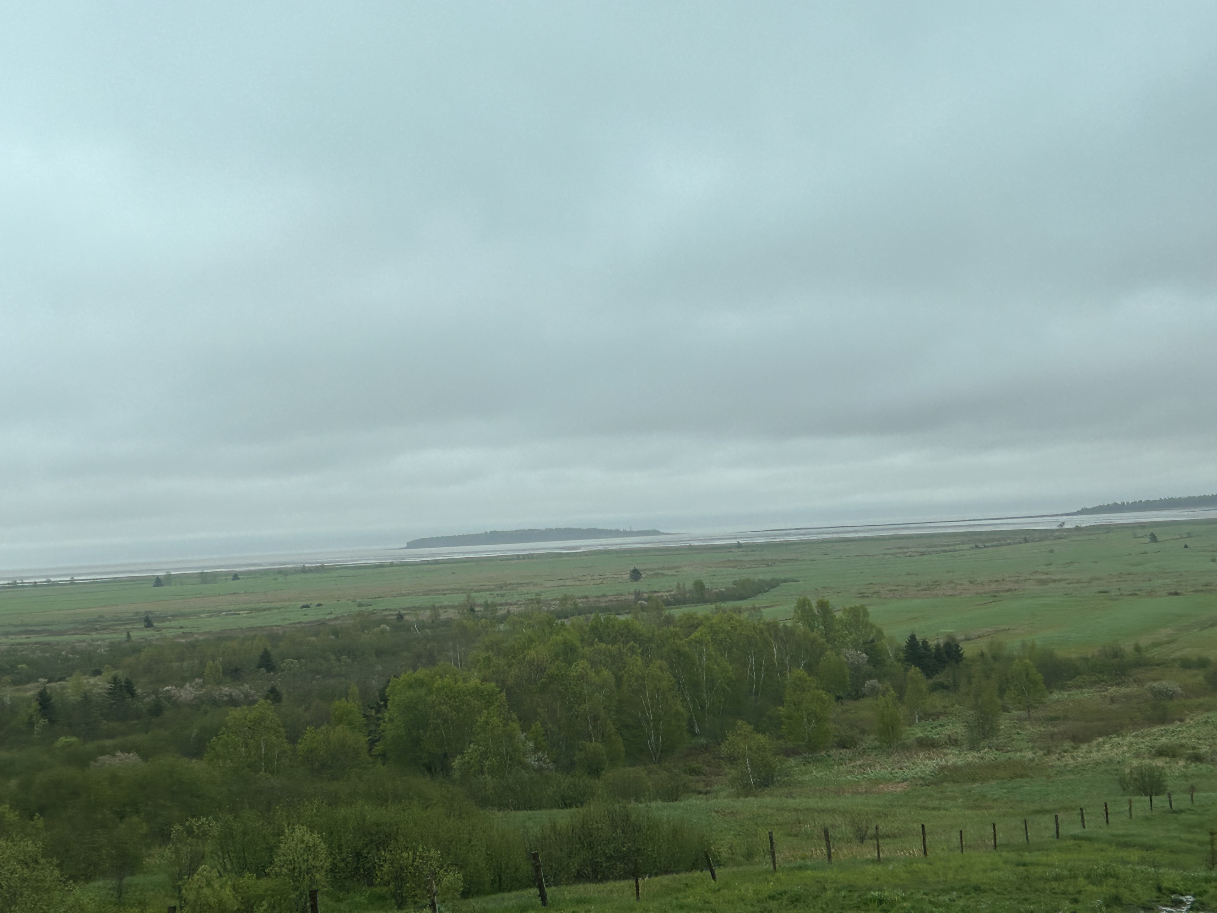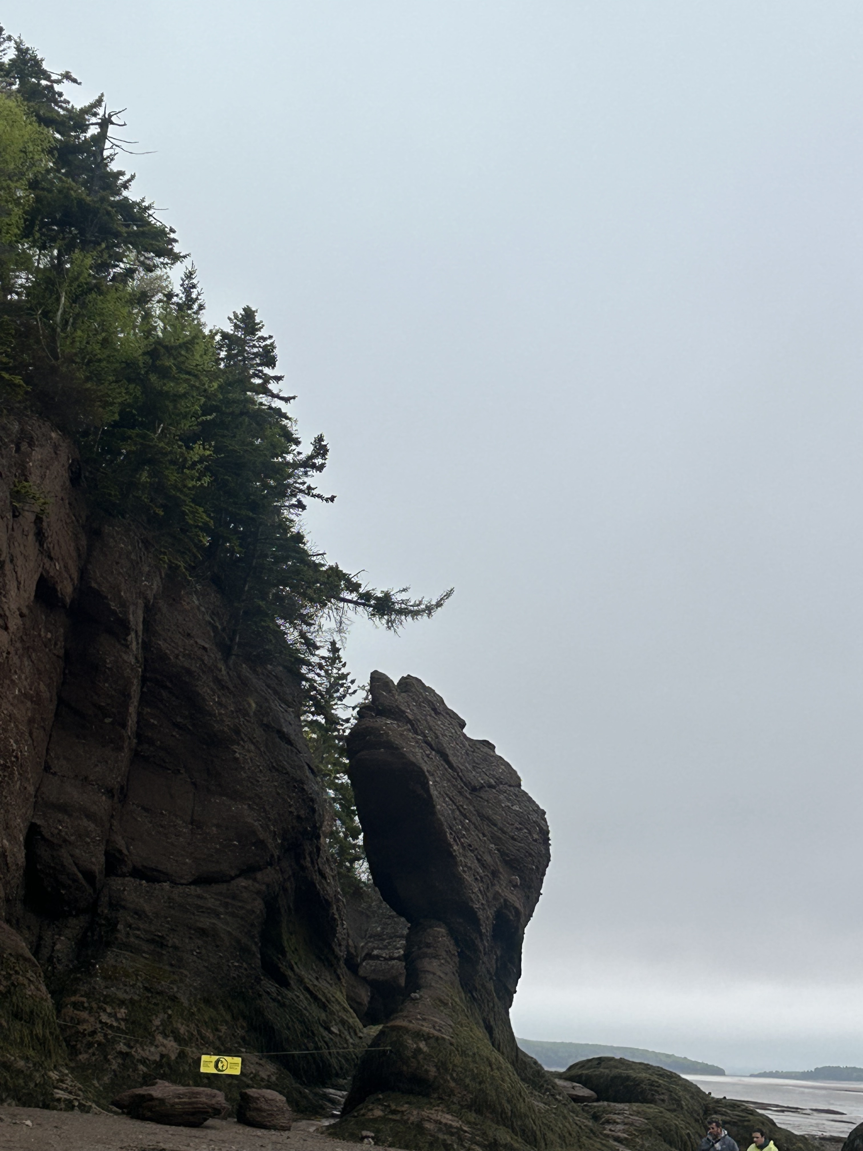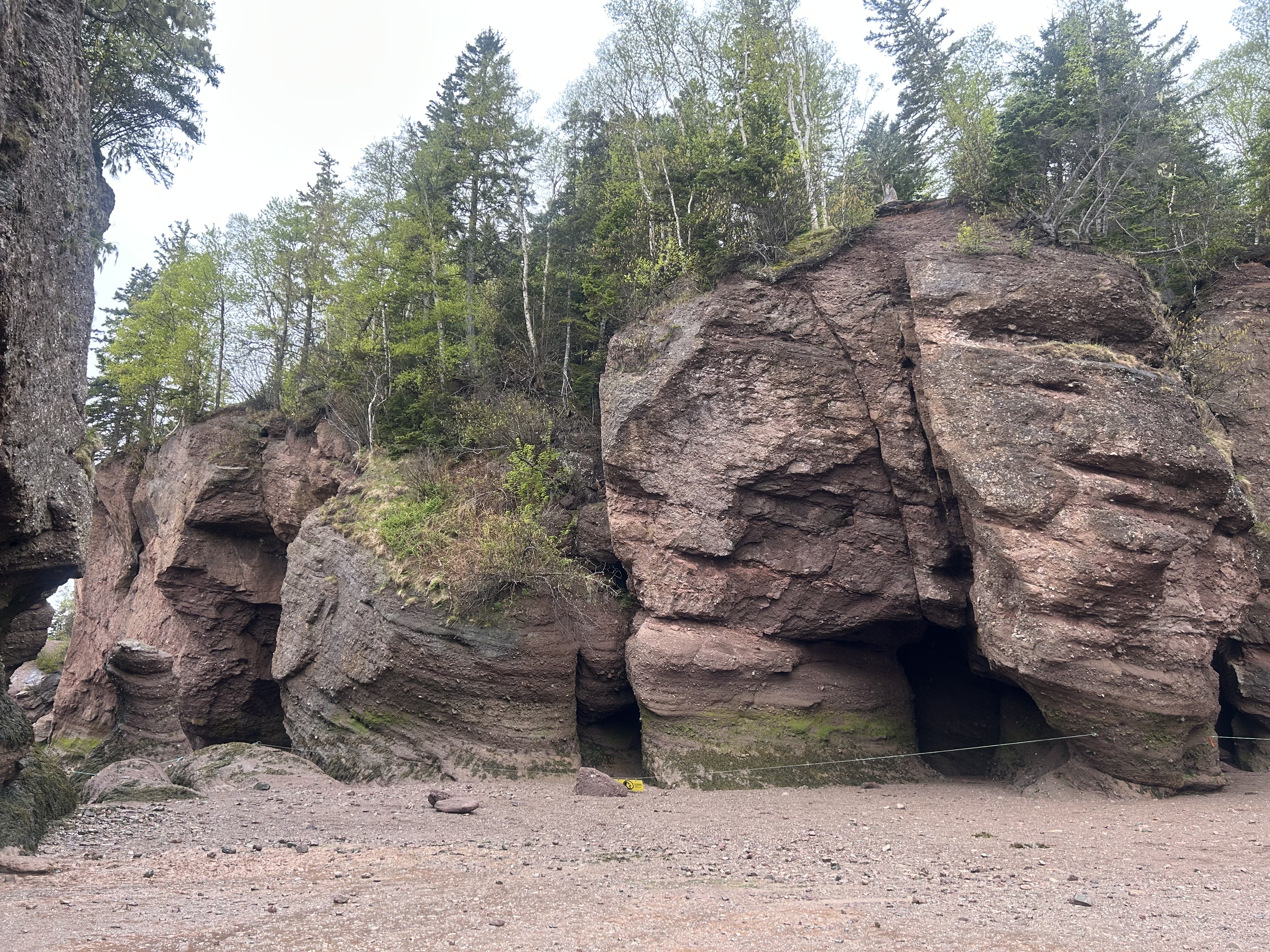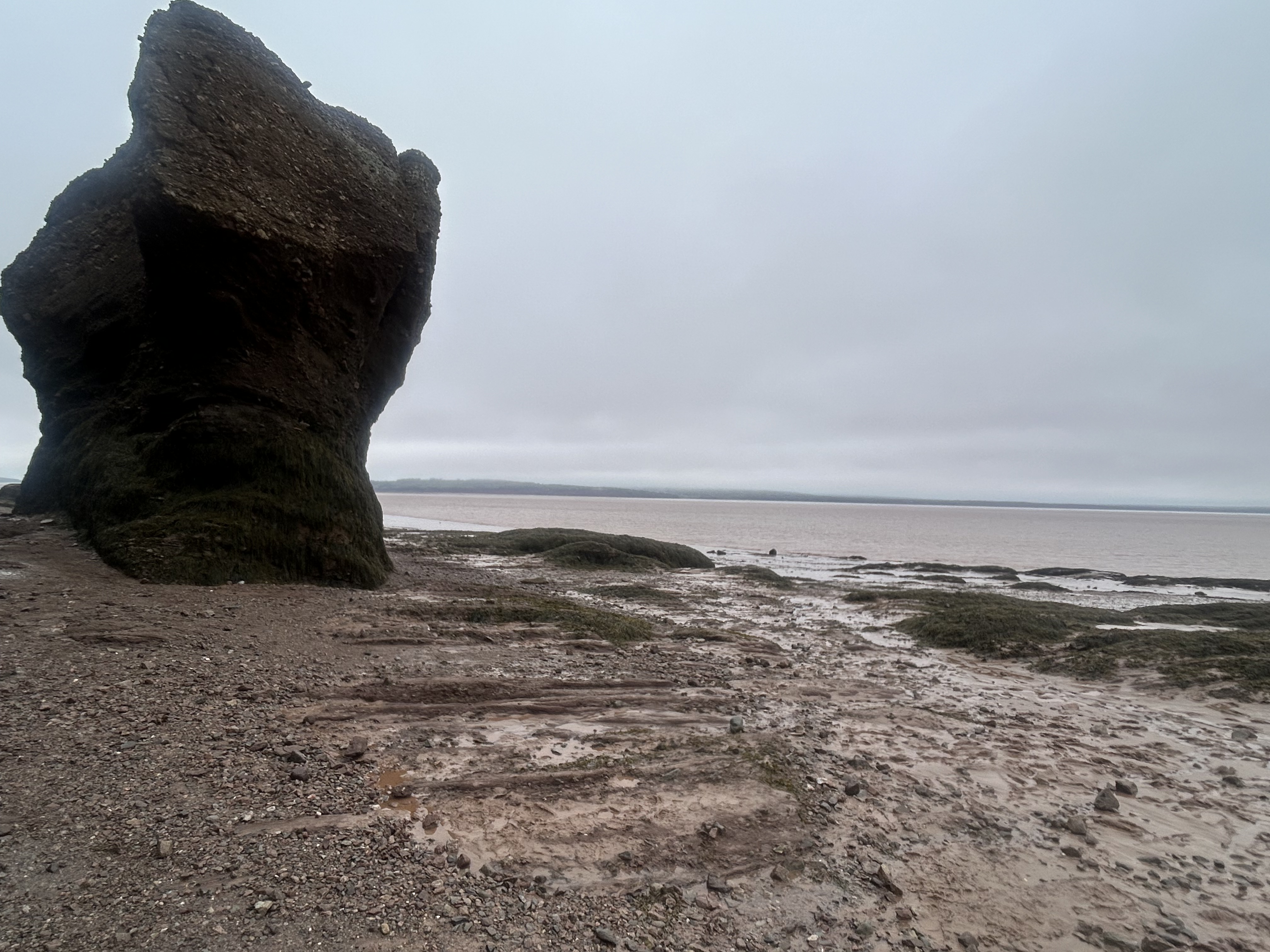 It was 3 pm and still drippy and grey but we rallied the troops (the dogs and ourselves) and drove 30 miles through lush green rolling hills and thick fringes of forest showcasing the wide range of expressions of green: from a pale, light green from new growth leaves to a rich, deep, dark pine green of the evergreens. Maybe it’s early in the season, but I saw few grazing animals and even fewer tilled soils so I’m not sure how this land is used. There’s a lot of it and aside from the occasional white clapboard, black trimmed window farm and country houses, our two lane country road took us along its winding, circuitous ribbony way, leading us for 30 miles to the “must see” Hopewell Rocks.