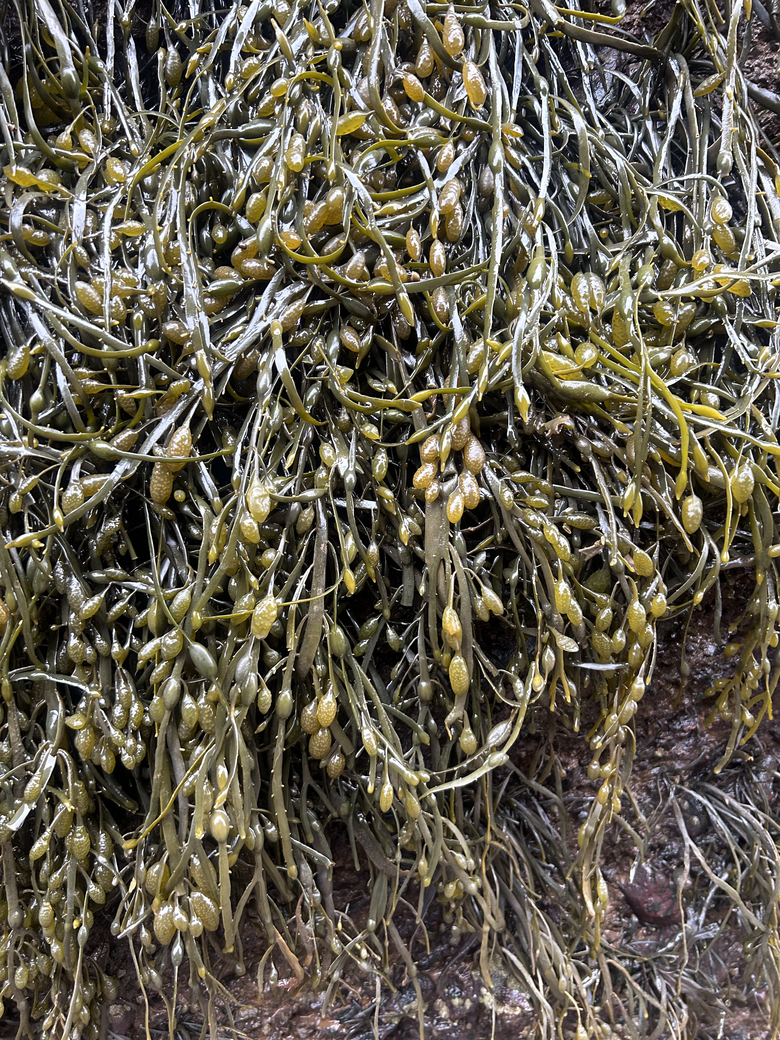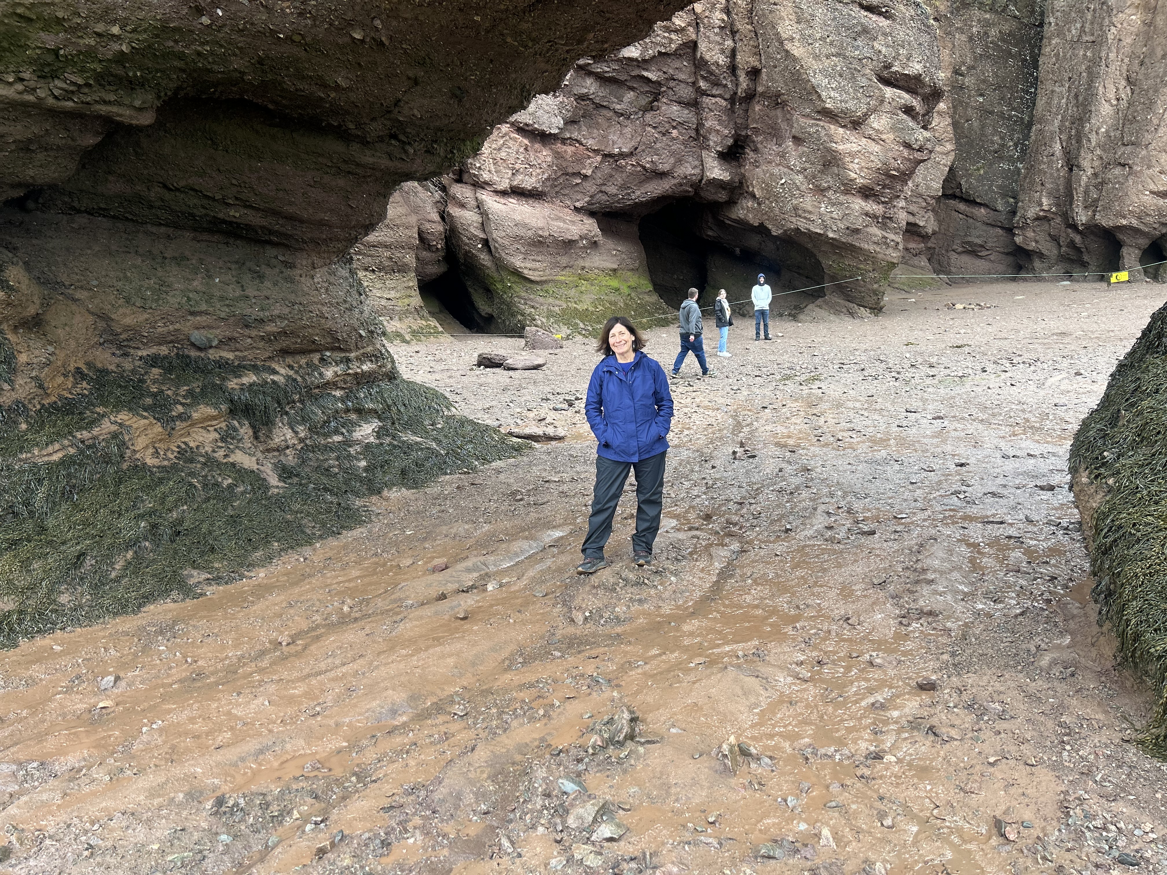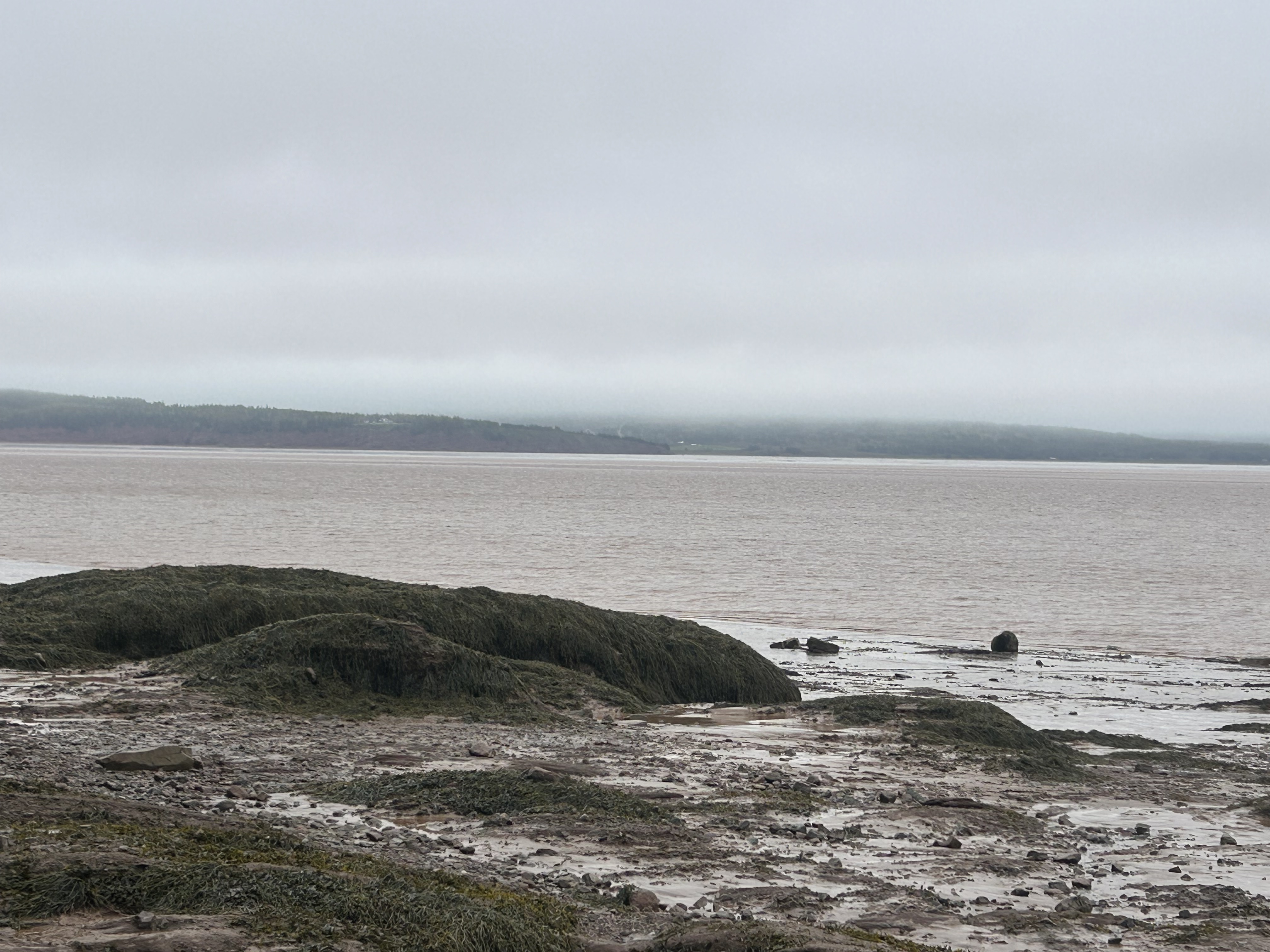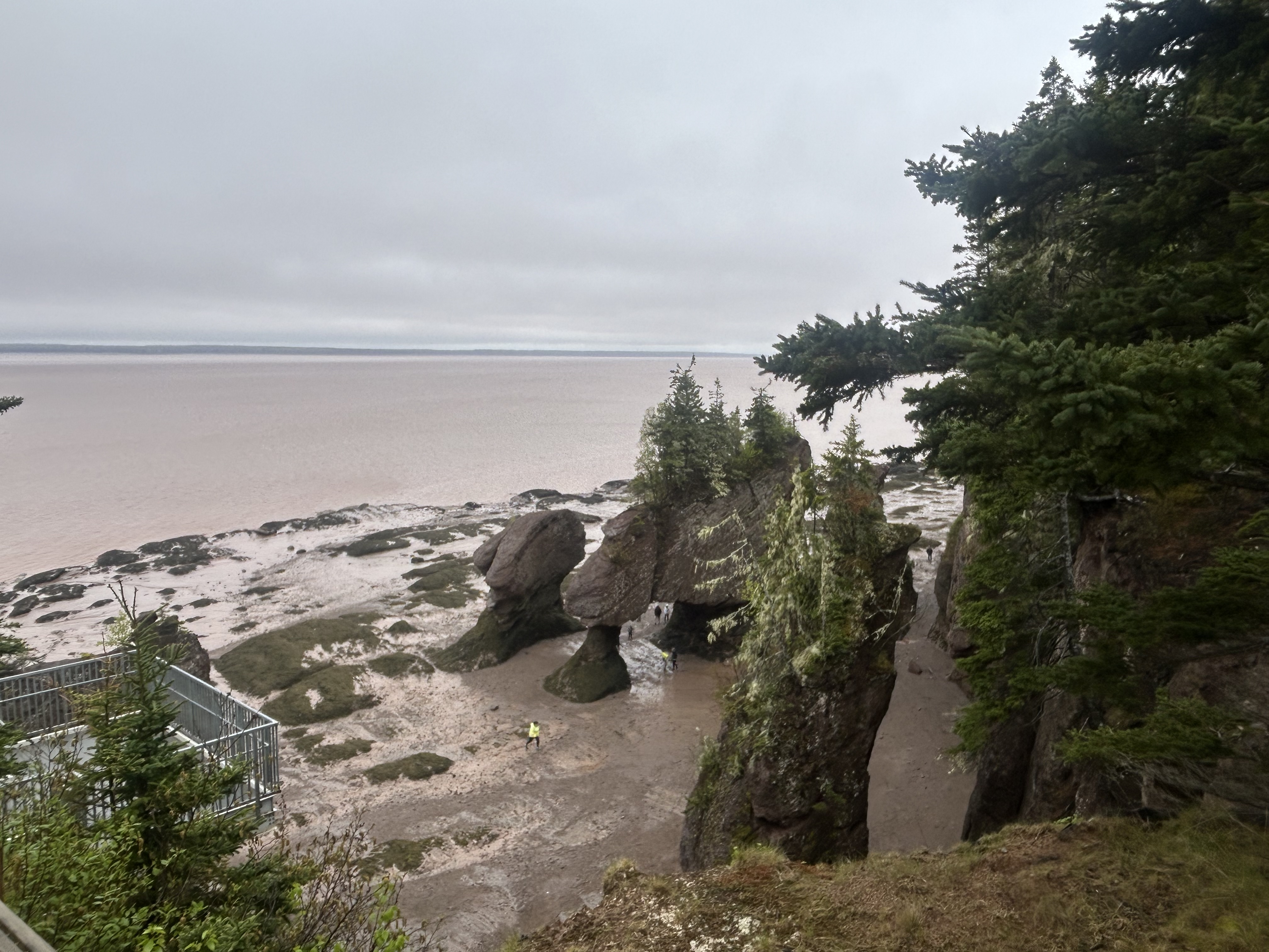 It was 3 pm and still drippy and grey but we rallied the troops (the dogs and ourselves) and drove 30 miles through lush green rolling hills and thick fringes of forest showcasing the wide range of expressions of green: from a pale, light green from new growth leaves to a rich, deep, dark pine green of the evergreens. Maybe it’s early in the season, but I saw few grazing animals and even fewer tilled soils so I’m not sure how this land is used. There’s a lot of it and aside from the occasional white clapboard, black trimmed window farm and country houses, our two lane country road took us along its winding, circuitous ribbony way, leading us for 30 miles to the “must see” Hopewell Rocks.