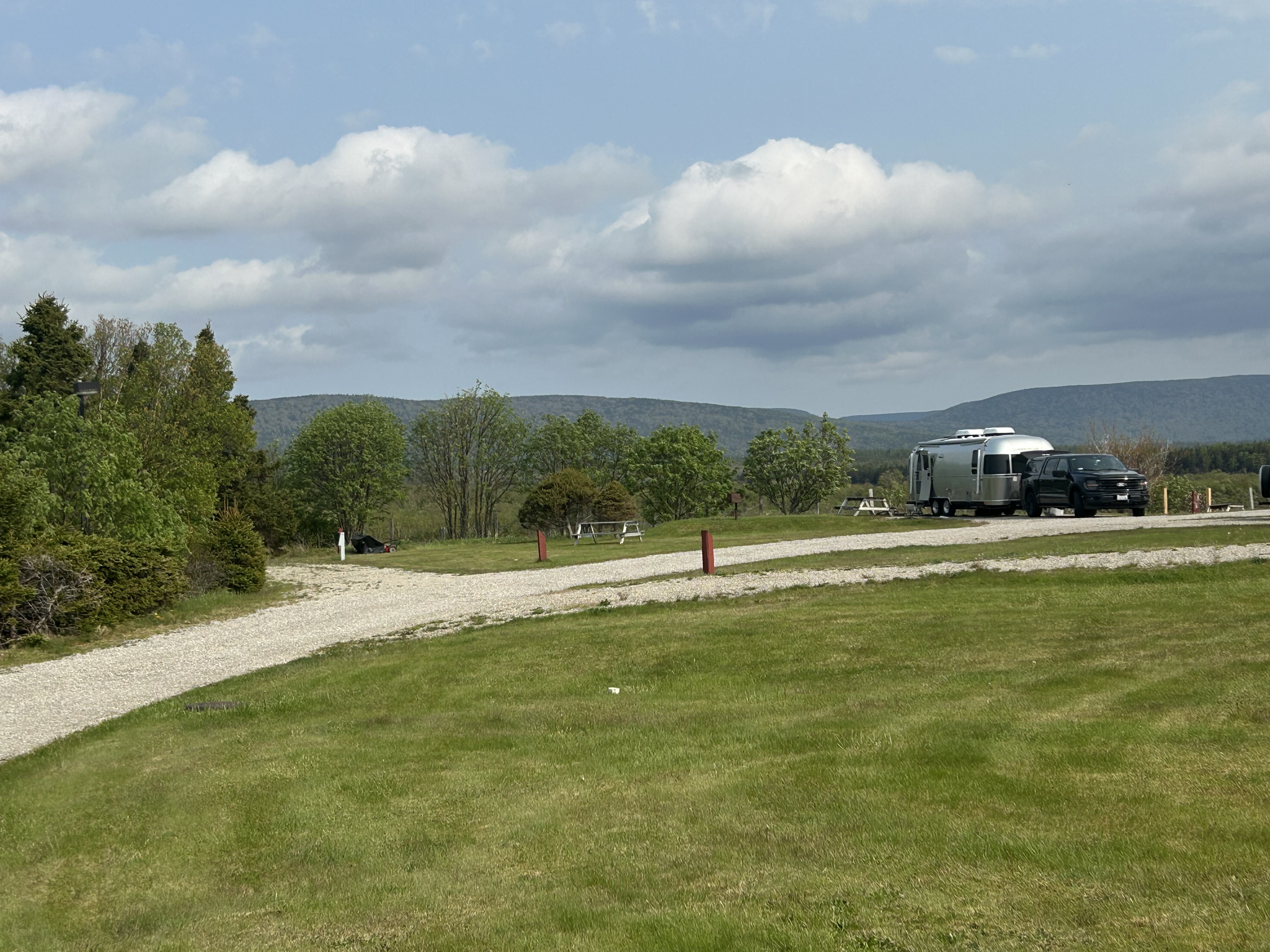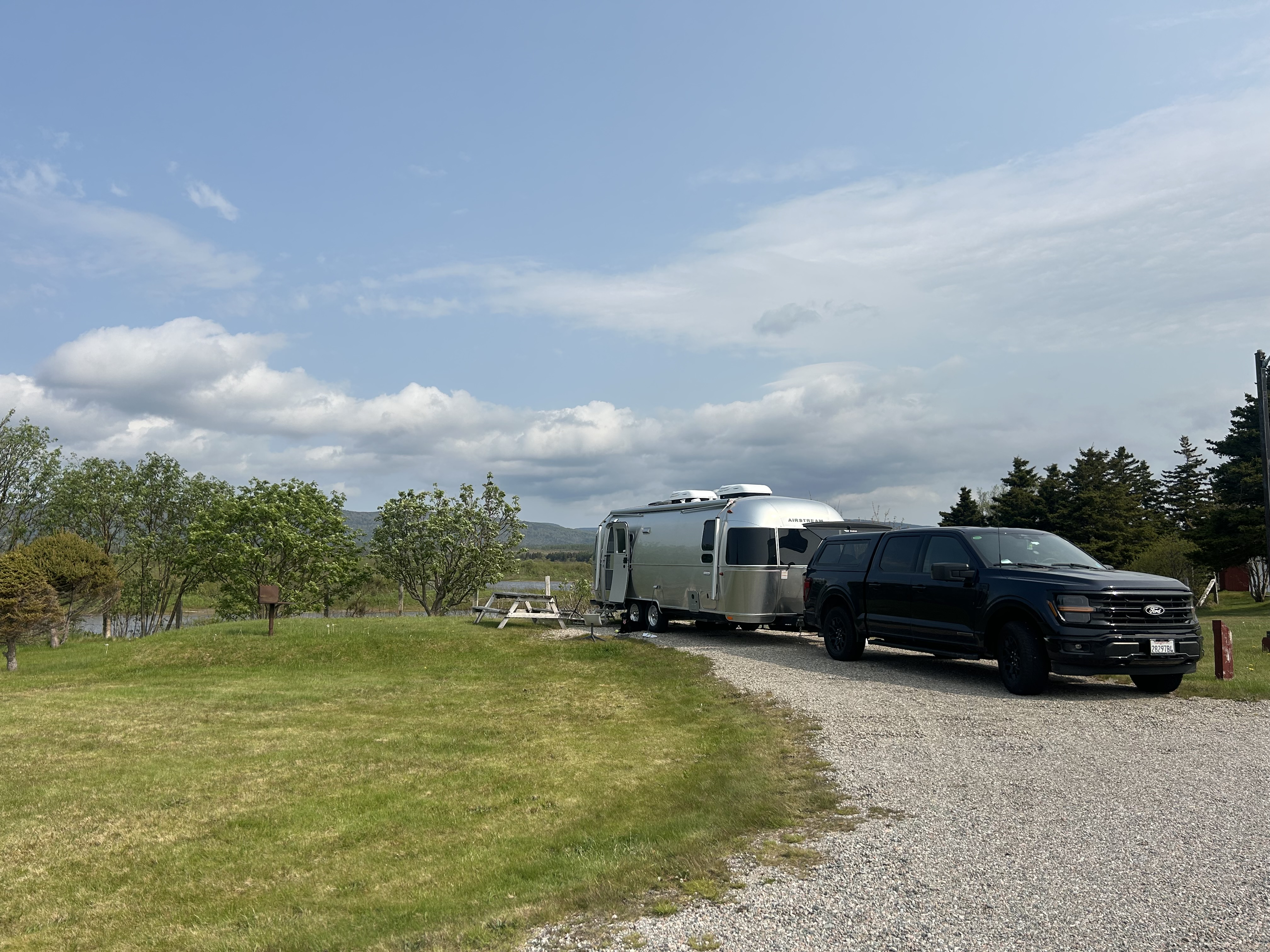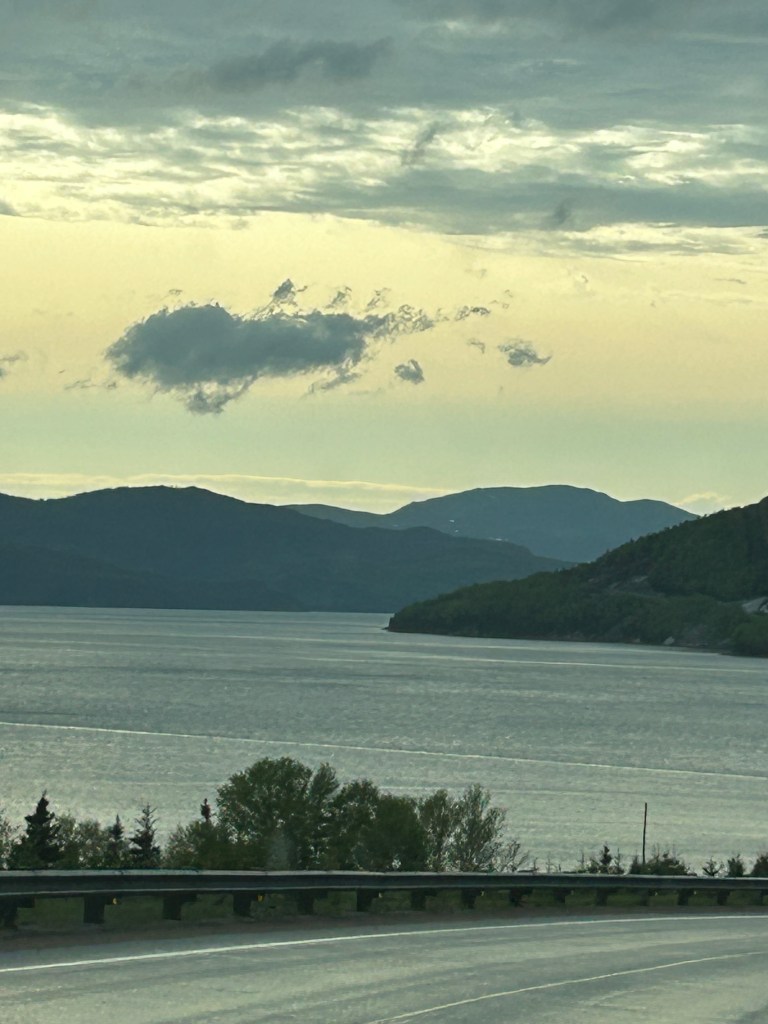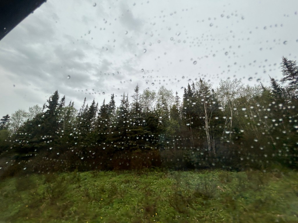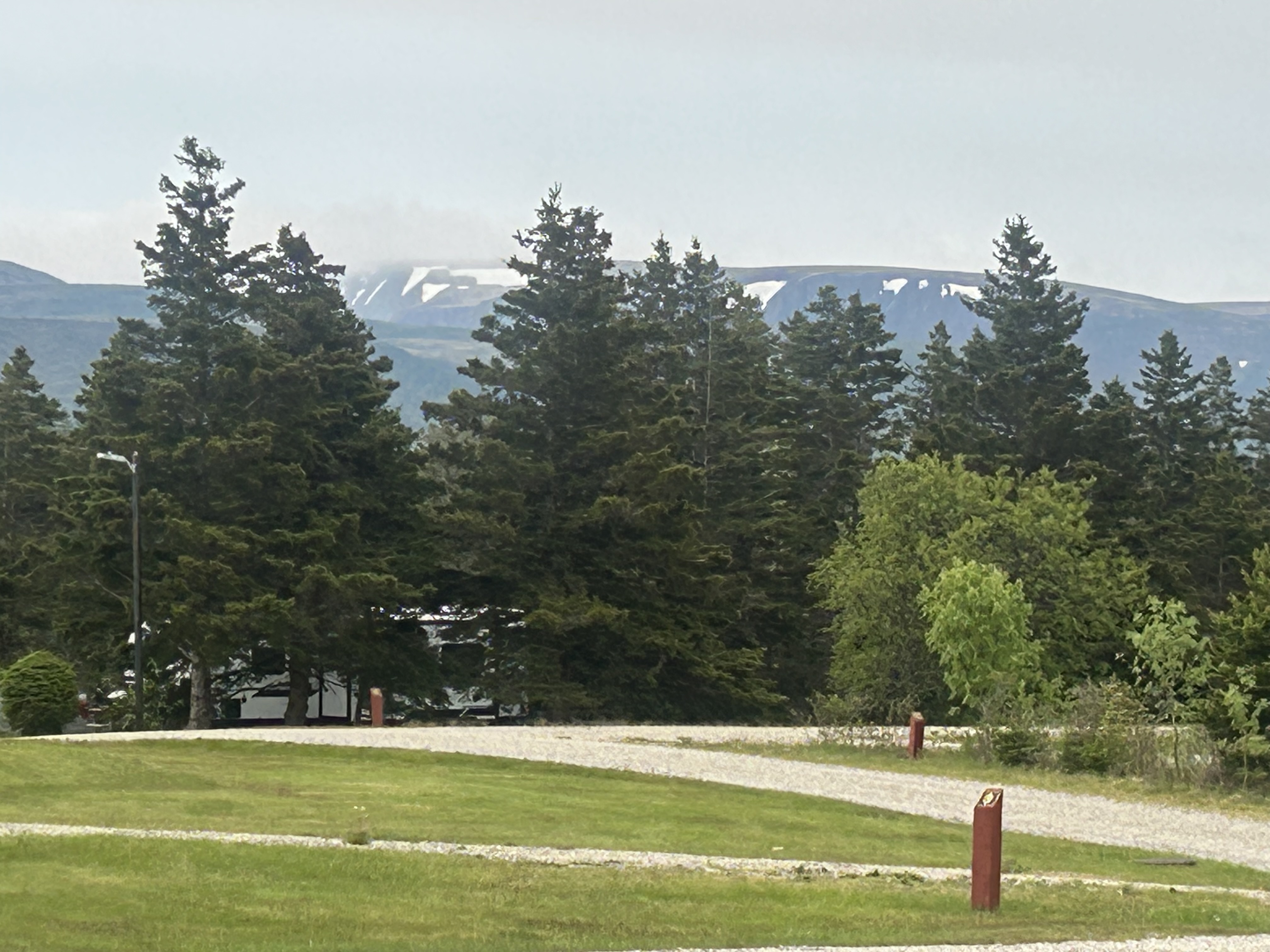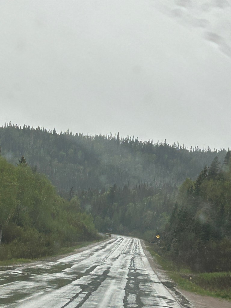 Codroy Campground and this area are places we could definitely return to if we get tired of being so far up north. The campground’s “check out” time is a generous 2 pm and we were on the road by 1:45 pm. What we didn’t expect was a solid one hour downpour about an hour into our drive. We’d stopped to get a few groceries in the larger town of Corner Brook and coming out of the grocery store, the heavens had opened up and the rain was fierce. Starting our drive into the mountains, surrounded by lush, thick stands of evergreen trees, the usual 60 mph ride on the Trans Canada Highway turned closer into 40 mph over ponding, pot holed pavement that had clear grooves created by steady truck traffic. The ponding was really daunting.