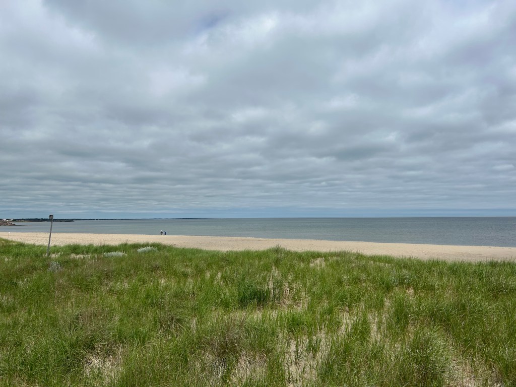 On the way back to camp, we stopped at Parlee Beach. Making your way through sea grass and sandy dunes, there’s a clean sweep of sandy beach. Unfortunately for us, there was also a lifeguard despite the time of day (5 pm). We didn’t feel we could easily let the dogs off leash so we returned to what is heaven-for-dogs: our campsite. We have a complete corner of the campground to ourselves and Lily and Cali have clearly claimed this acre as theirs. Fortunately, everyone loves a lab and they are giving Lily (and us) a lot of slack, letting her romp around, chasing balls nonstop. There is a father/daughter camping duo about 200 yards on the other side of the grassy field from us. Fortunately, not only do they love labs and Lily, but they both have great throwing arms. So together we tag teamed and wore her out.