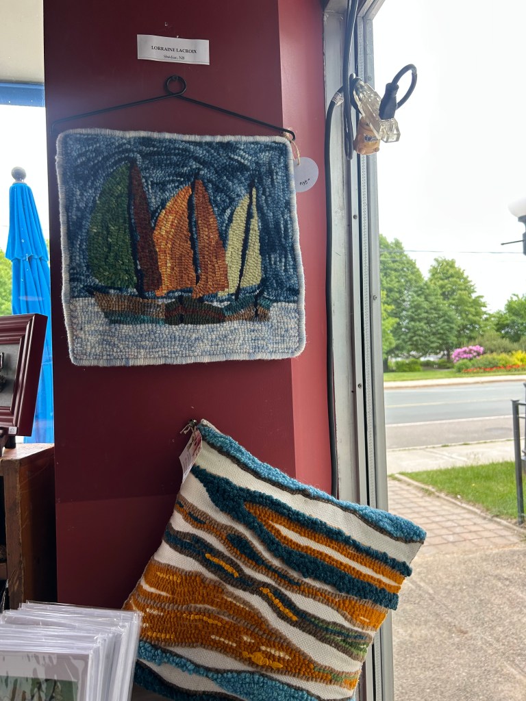 The boardwalk was peaceful (except for the 50 school kids, but that was ok), and at the end, I went down to the beach for a final toe-to-ocean kiss and headed back. The next stop was, at Larraine’s suggestion, the Society Culturelle de Bouctouche, a cafe and art shop that was showcasing some of her art, yarn-hooked pillows and wall art.