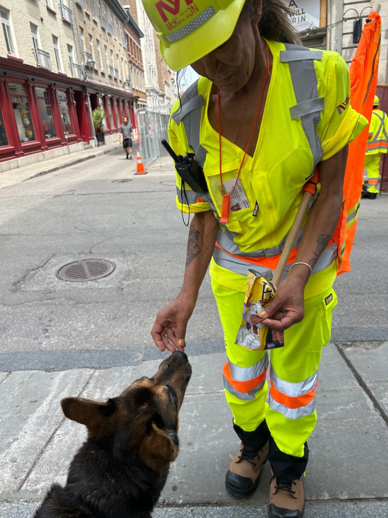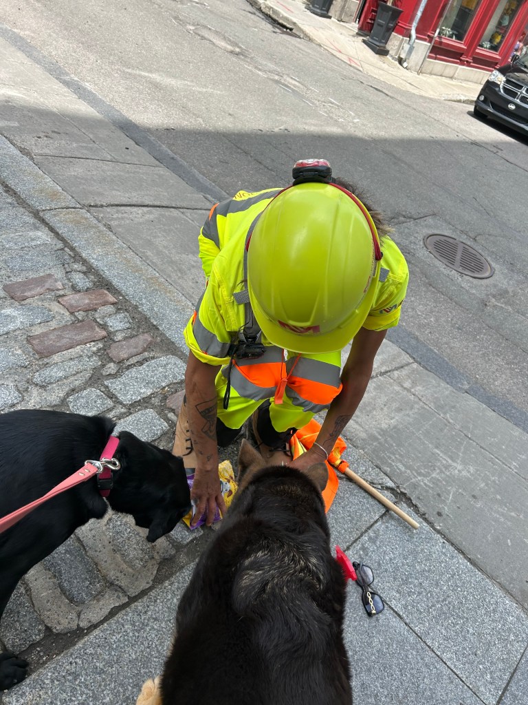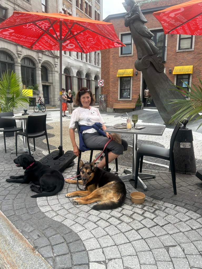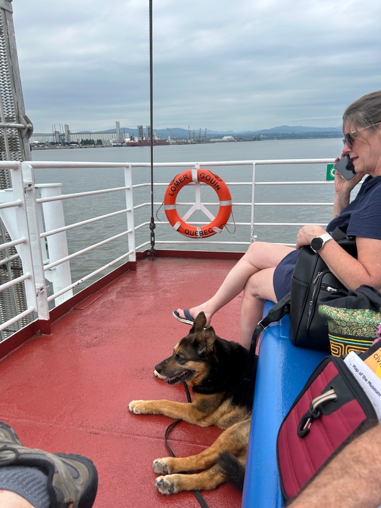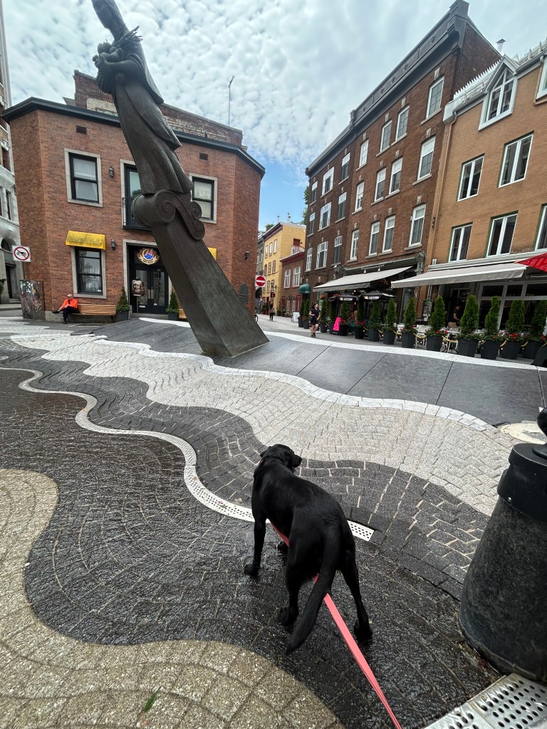 We left camp with the highest of intentions and they lasted about two hours. W took the ferry to the Old City and Peter peeled off to go to the Musee de Civilisation while the dogs and I wandered around the streets, passing art galleries, barber shops, cafes and restaurants. A number of the galleries left out dog water bowls. Given the heat and humidity even at late morning, the dogs (and I) were most appreciative.