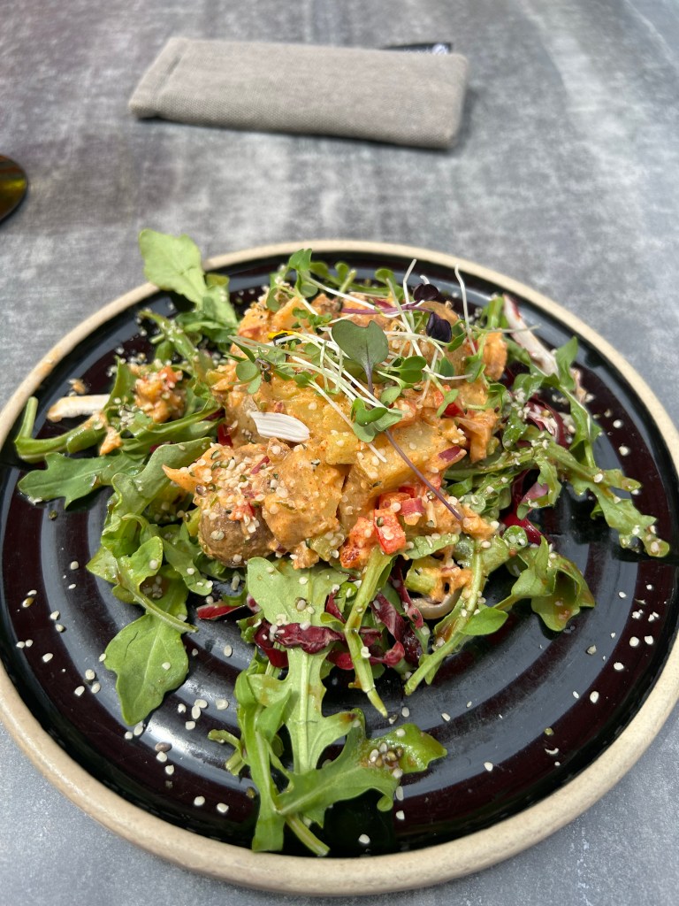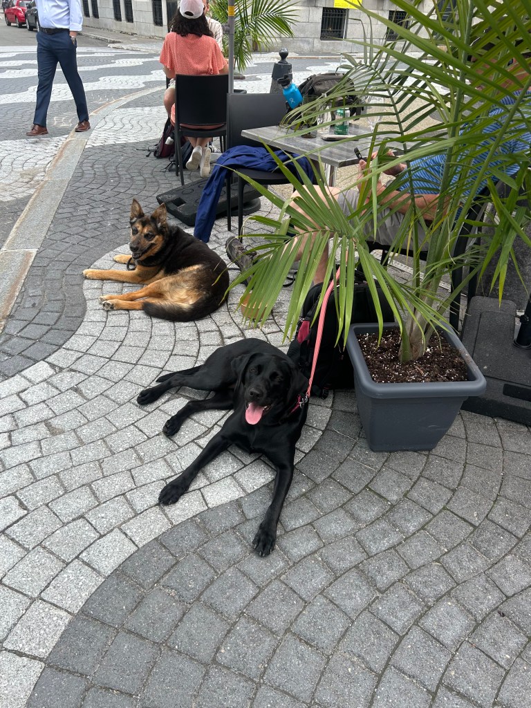 I settled on an outdoor cafe by a water feature that I knew Lily would like. The server was so pleasant and of course gave them water before me. I ordered the lunch special which included a potato salad unlike any I’d had and a risotto with vegetables. It felt so decadent just sitting outside, watching people, have them watch mostly the dogs, and letting the time pass peacefully.