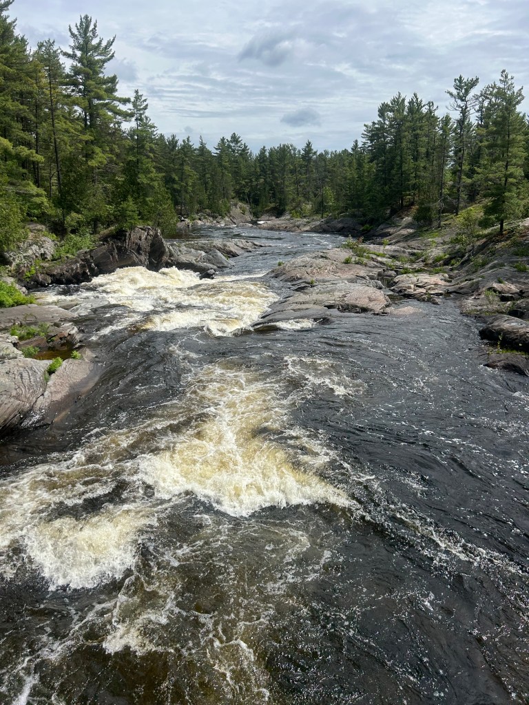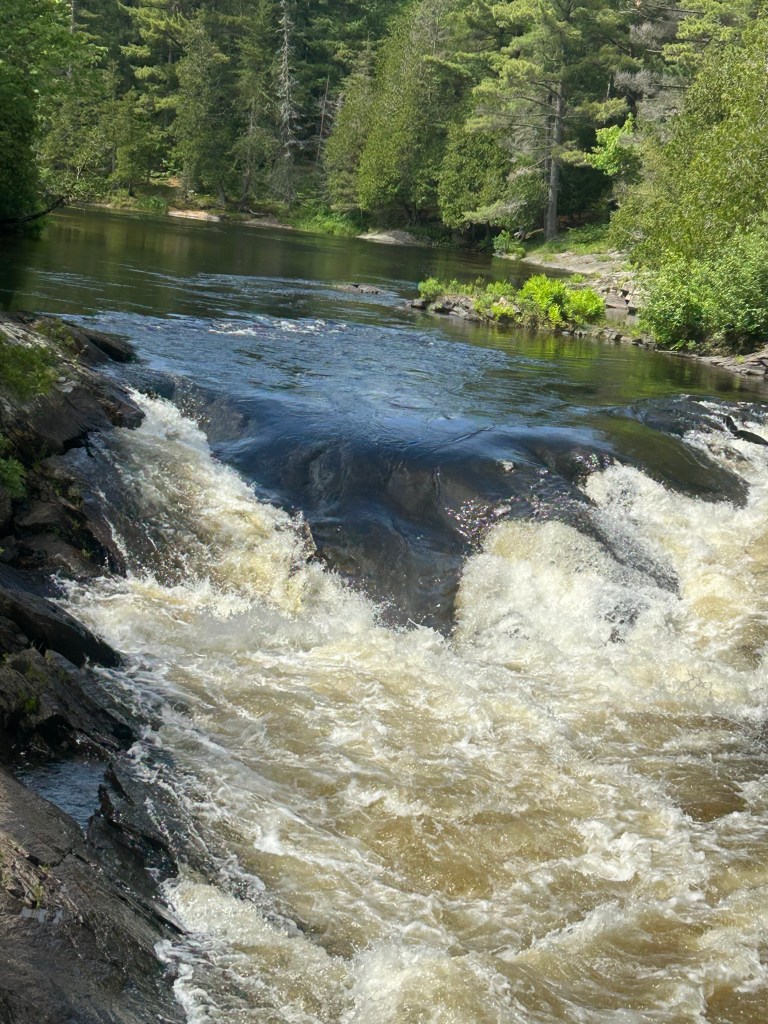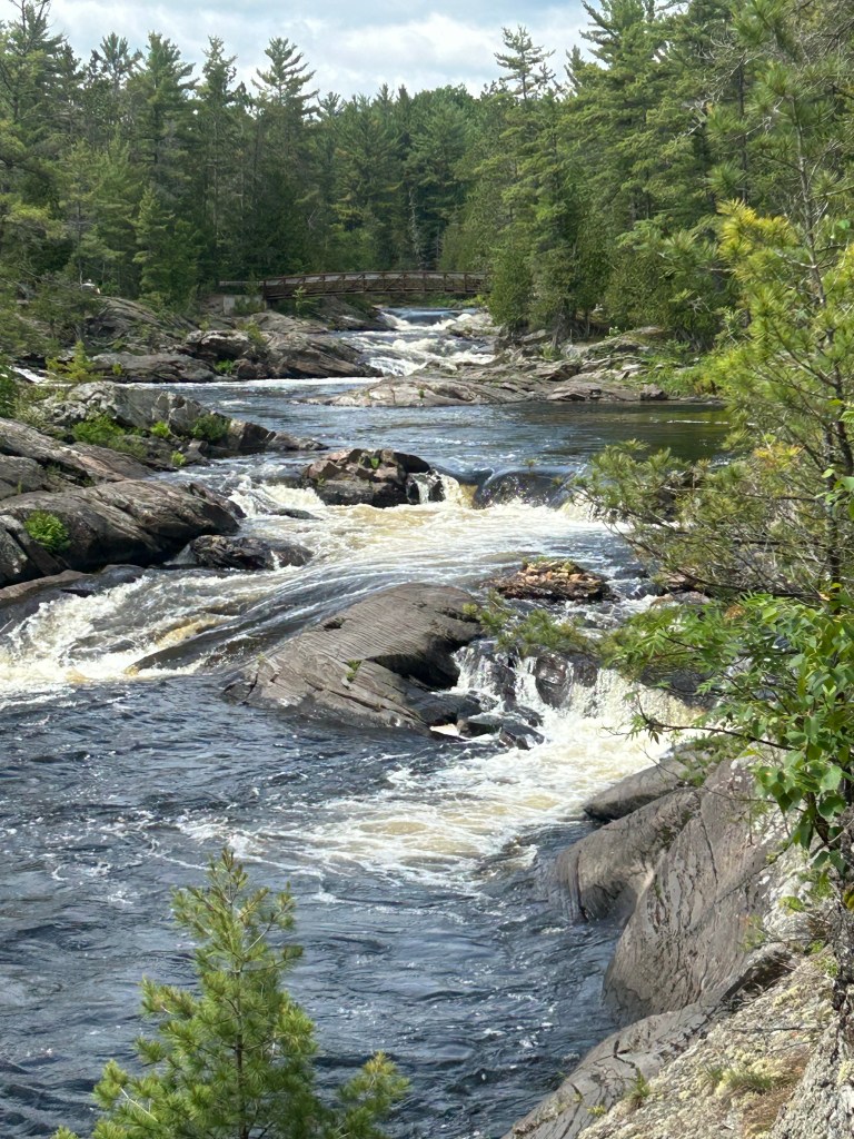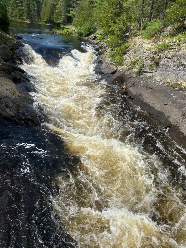Peter took off for a few hours and went to a larger town down the road as Massey doesn’t offer a whole lot of options. I took the dogs on two different hikes starting within the campground, which is a provincial park. The first took us by and over two beautiful falls and rivers combining into one: the Spanish River and the Aux Sables River. The second hike was also within the park but in the opposite direction: to the beach and swimming hole created by these rushing rivers that pool before they resume their journey. Lily had a blast, once again, swimming and endlessly chasing balls. Her energy is truly impressive. But Cali, at 15, held her own and hiked over two miles.