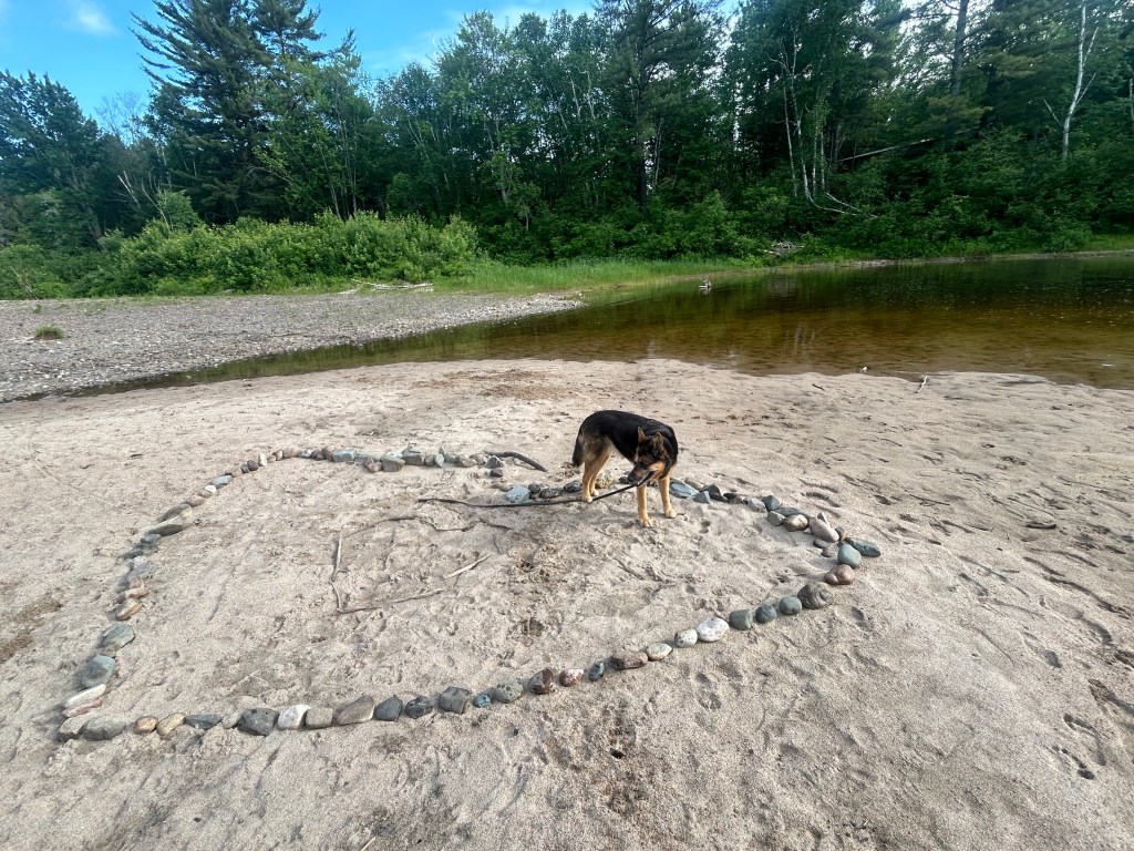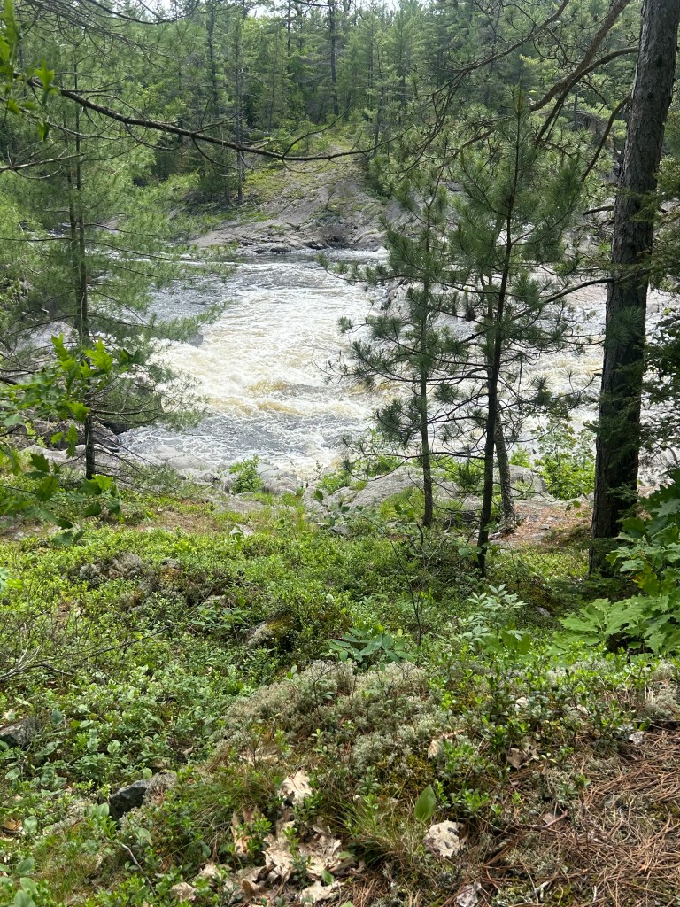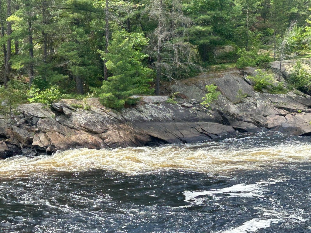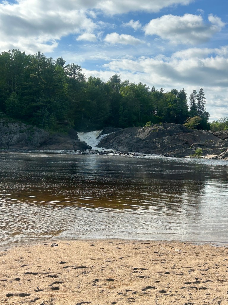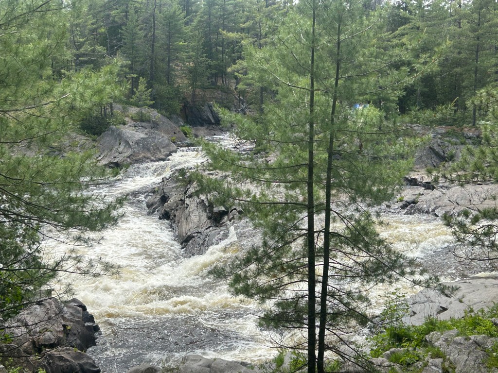 Peter took off for a few hours and went to a larger town down the road as Massey doesn’t offer a whole lot of options. I took the dogs on two different hikes starting within the campground, which is a provincial park. The first took us by and over two beautiful falls and rivers combining into one: the Spanish River and the Aux Sables River. The second hike was also within the park but in the opposite direction: to the beach and swimming hole created by these rushing rivers that pool before they resume their journey. Lily had a blast, once again, swimming and endlessly chasing balls. Her energy is truly impressive. But Cali, at 15, held her own and hiked over two miles.