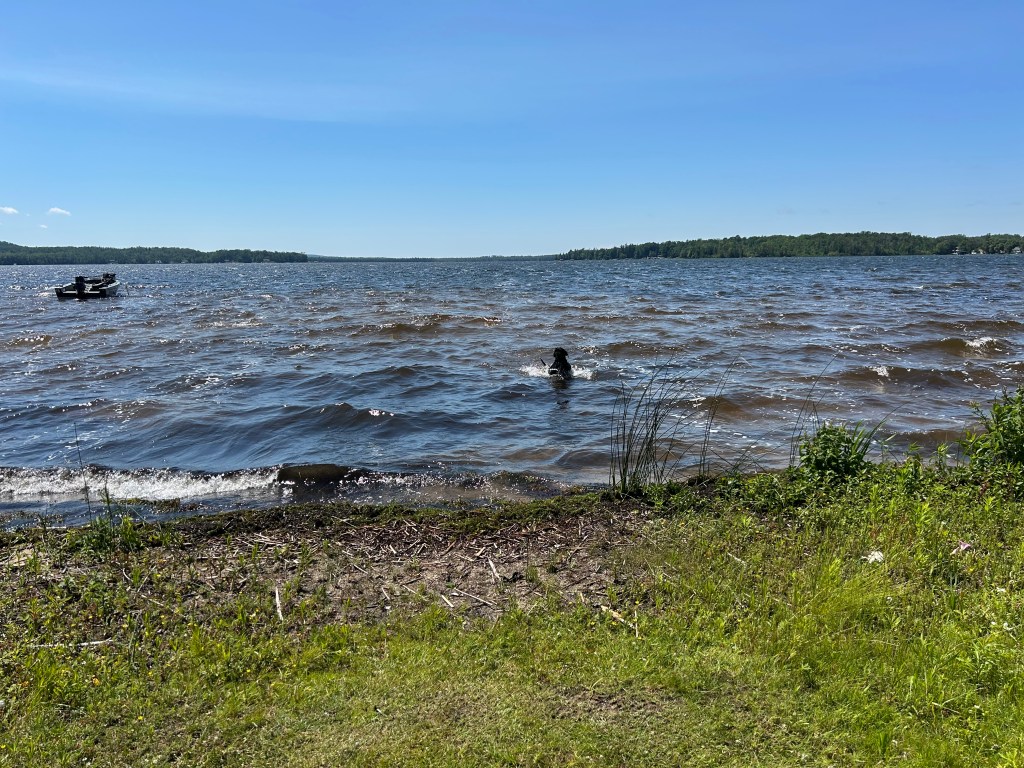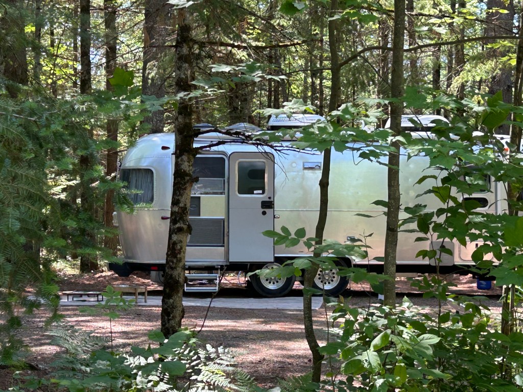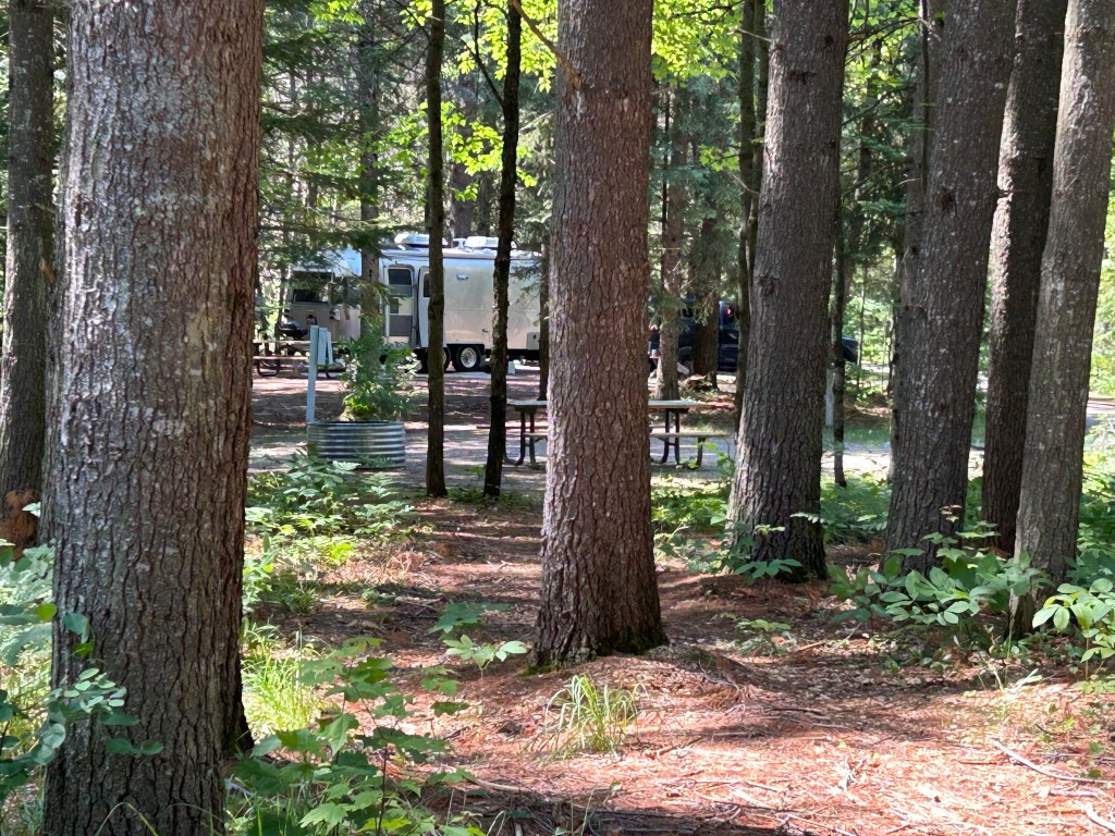 So, what we have, 40 miles southwest of where we were, is a wooded site with power and water, spaciousness (except for a couple on one side), a lake, river and open field 5 -15 minutes walk away, and no human sound. The only sounds are birds and the wind through the trees (oh, and the mosquitos but we’re sweating DEET these days so no matter). Considering it’s supposed to heat up this week and we don’t have air conditioning (unless I can reconfigure our RV to run one air conditioner on 30 amps), having shade isn’t such a bad thing.