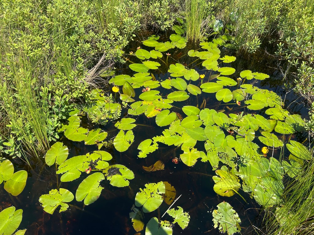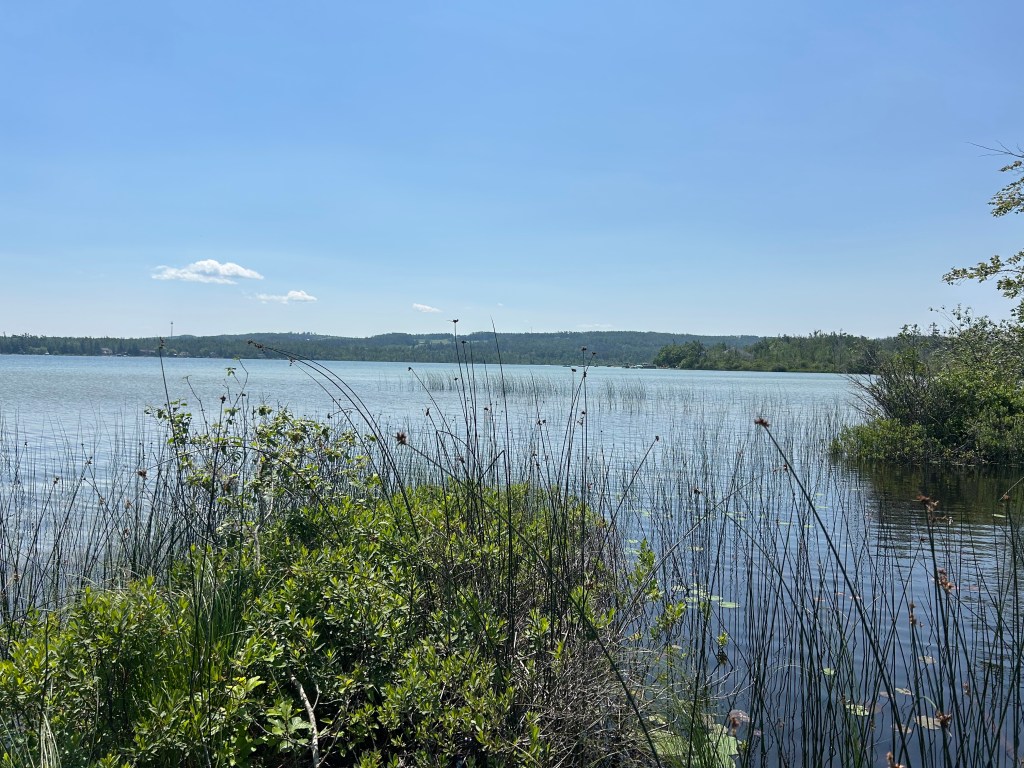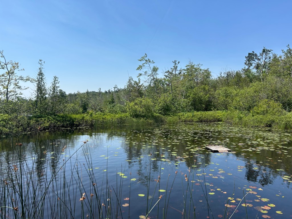 I found a nature walk with a loop to a lake that seemed to fit the dogs’ needs if not mine. I’m ready to be out of the woods. They’re buggy, boring and claustrophobic. Yes, I know there are many things to admire about the woods and I appreciate them. But I’m ready for a little more wide open spaces, like a lake or green pastures or a hill. I’m trying to enjoy the terrain and environment I’m in.