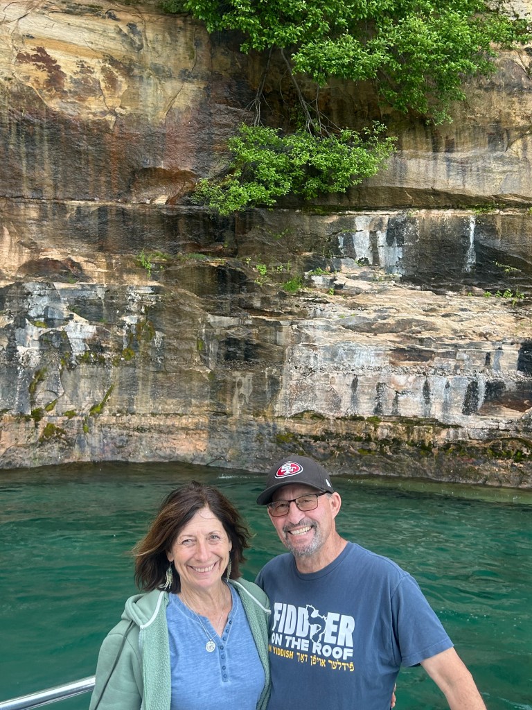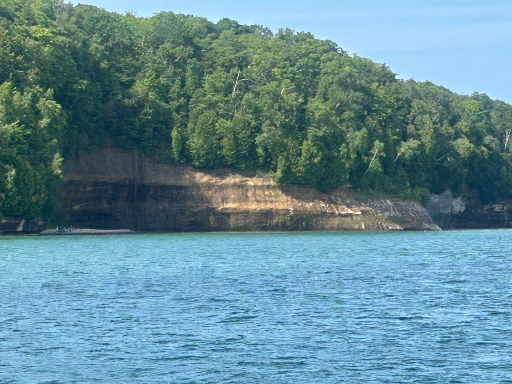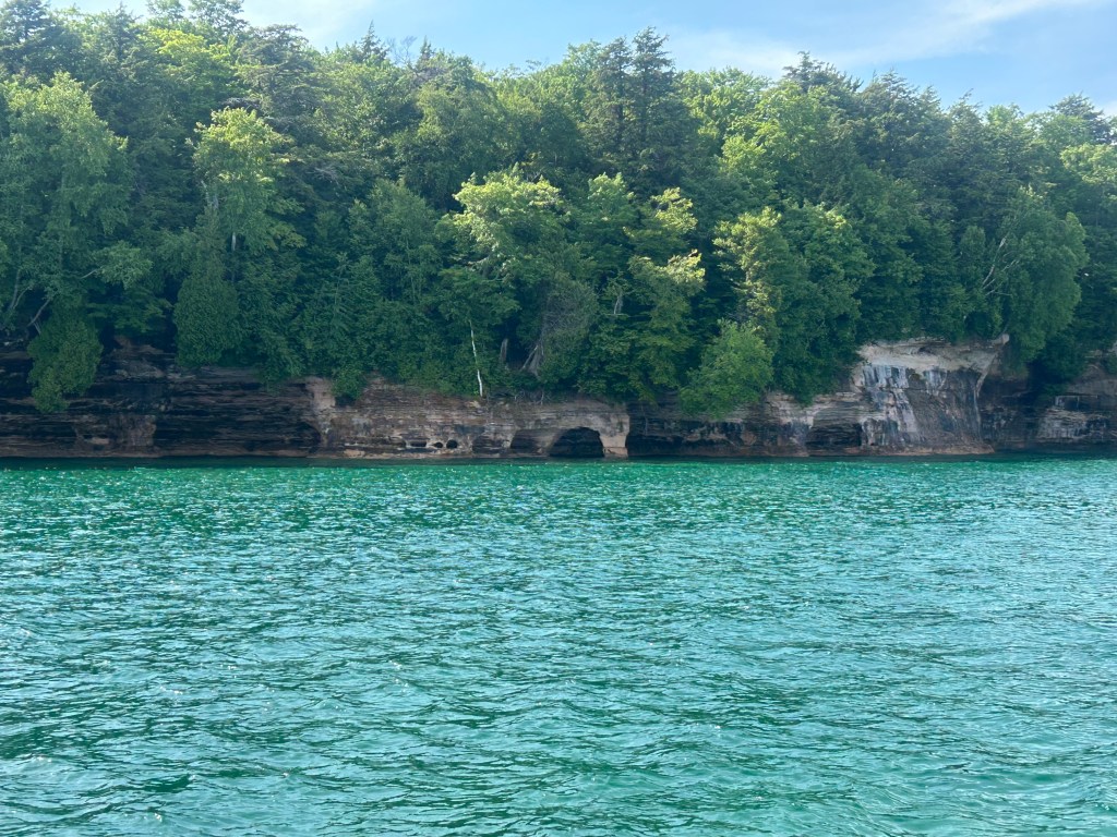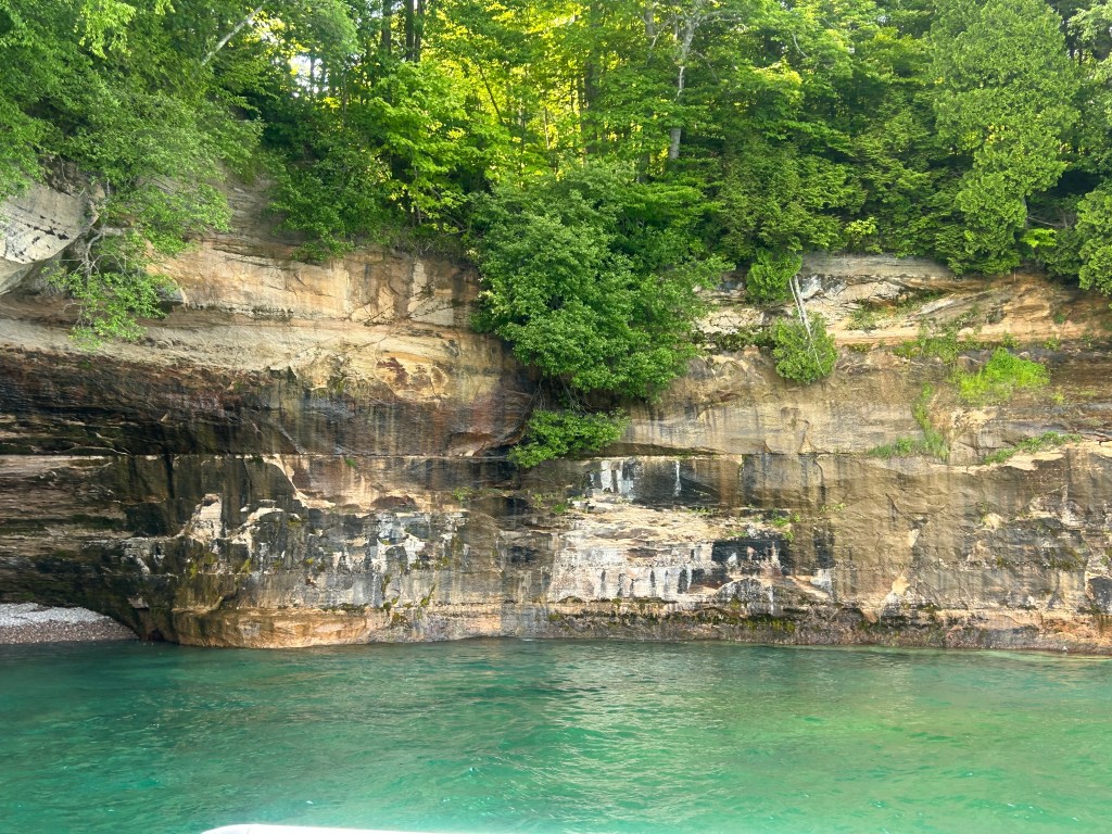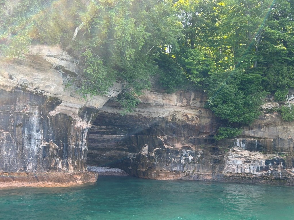 Next stop: Munising, 50 minutes away, across the width of the Upper Peninsula and on the shores of Lake Superior. Following our camping neighbor’s suggestion, we took a two hour boat cruise on the Lake Superior bay around Grand Island. A glass bottom boat gave us a unique vantage point of two different shipwrecks. We floated past “Picture Rocks” with striated layers of rock showcasing different geological periods. The boat was a unique way to experience Lake Superior; serene to be on the water, inspiring to see the bottom of the lake and clarity of its water, and a fun way to spend the late afternoon.