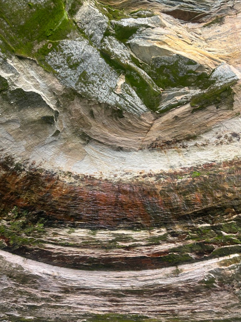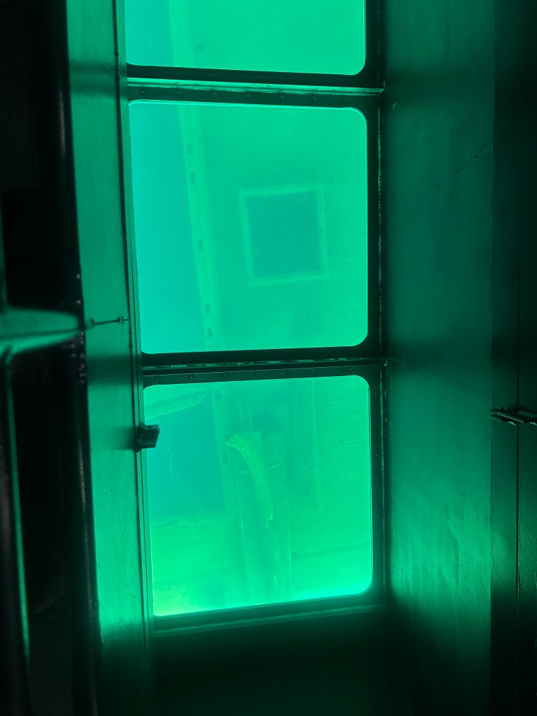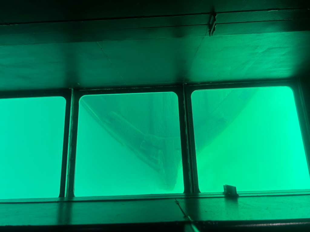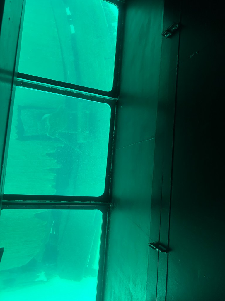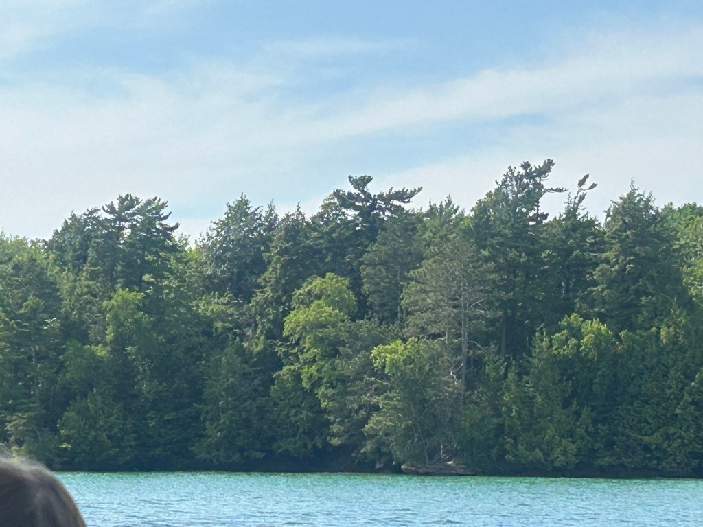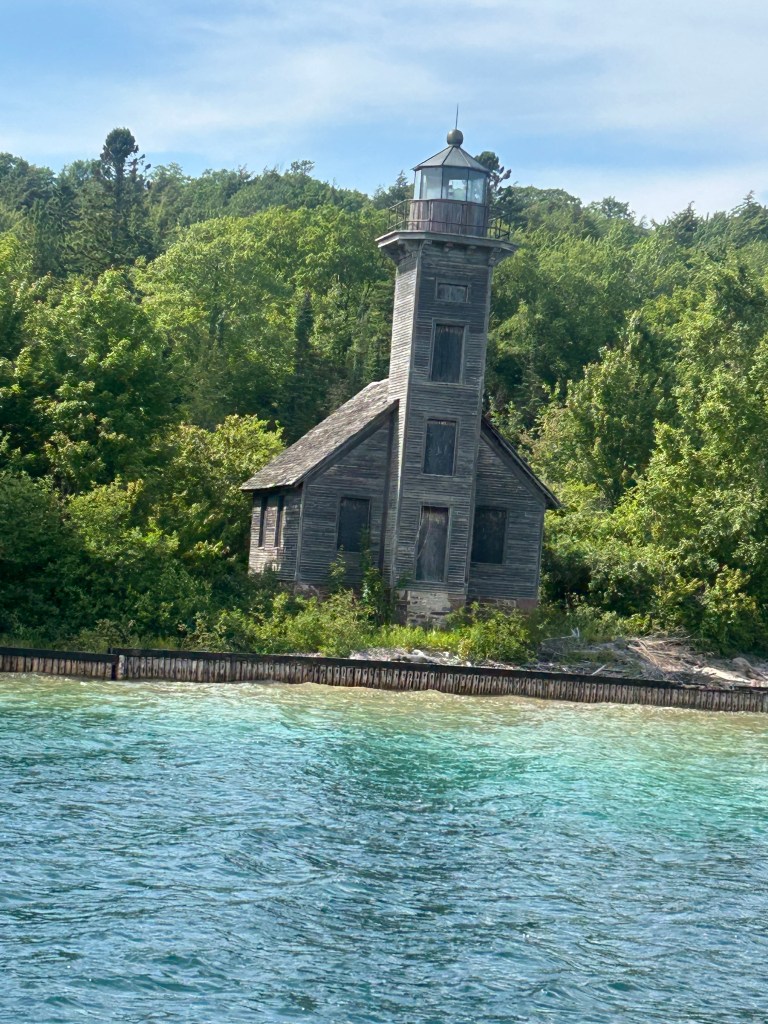 Next stop: Munising, 50 minutes away, across the width of the Upper Peninsula and on the shores of Lake Superior. Following our camping neighbor’s suggestion, we took a two hour boat cruise on the Lake Superior bay around Grand Island. A glass bottom boat gave us a unique vantage point of two different shipwrecks. We floated past “Picture Rocks” with striated layers of rock showcasing different geological periods. The boat was a unique way to experience Lake Superior; serene to be on the water, inspiring to see the bottom of the lake and clarity of its water, and a fun way to spend the late afternoon.