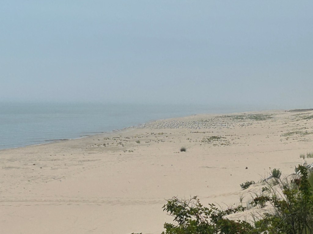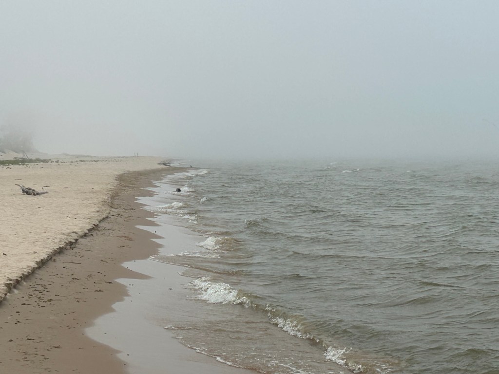 The day was generally slow paced in a woodsy camping kind of way. It’s very quiet and neighbors are far away from a campground perspective. We took some hikes right off our campsite to Lake Michigan, illegally threw chuck it balls in the wide open grassy playground because no one was there and eventually Lily and I went to the dog beach late afternoon. The fog had started to blow in portending weather changes. There was a chill in the air, which was at once a relief from the hot sticky temperatures of earlier in the day but again, there was that foreboding. It didn’t help that the weather service issued a Tornado watch and flood warning for our specific area. What to do when you’re in a trailer? Just ride it out I guess.
