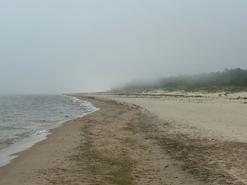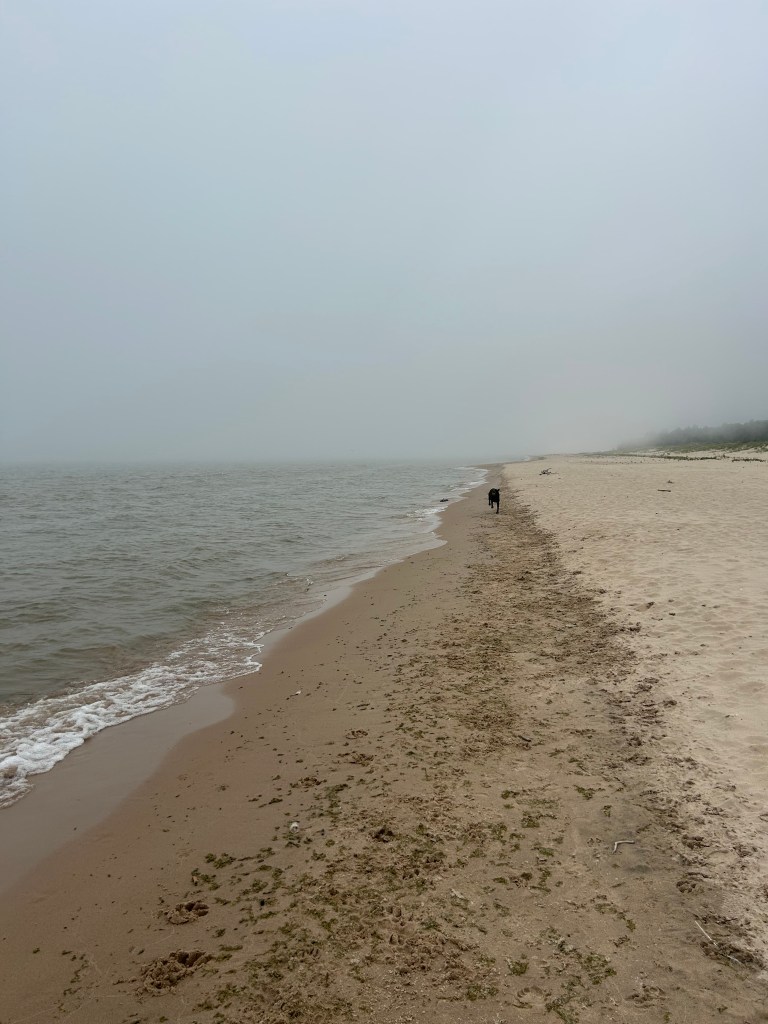 Returning, Lily and I went to the deserted dog beach to get her yayas out. The fog had set in and was blowing north to south. The tips of the trees were draped by a thin veneer of fog and the vast Lake Michigan had been reduced visibly to just off the shoreline. The steady roar of the waves as they rattled the shoreline lulled me into my own world. The fog added a sense of coziness in a wind whipped kind of way.
